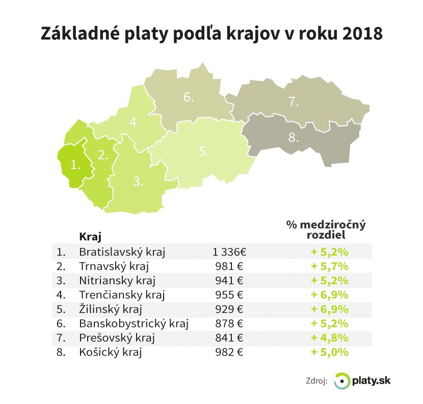 Platy rástli medziročne najviac v Trenčianskom a Žilinskom kraji. V oboch prípadoch narástla priemerná základná mzda o 6,9 percenta.