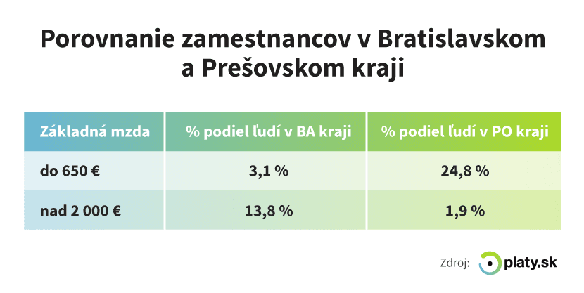 Porovnanie zamestnancov v Bratislavskom a Prešovskom kraji ukazuje obrovskú priepasť medzi platmi. Kým základný plat do 650 eur v hrubom majú v bratislavskom regióne iba zhruba 3 percentá ľudí, v Prešove a okolí je to takmer štvrtina.