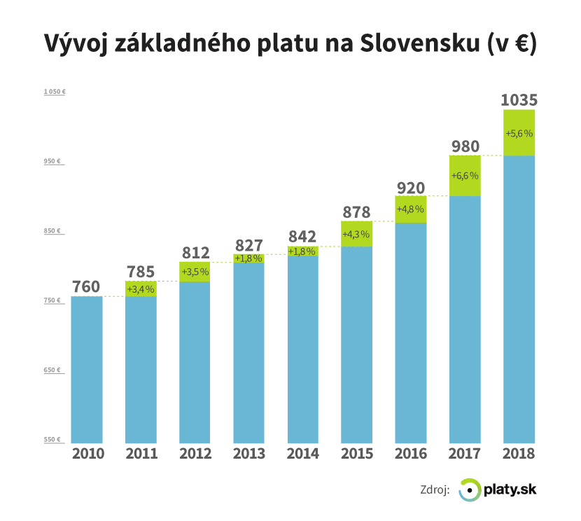 1035. Taká bola priemerná mesačná základná mzda v roku 2018. Oproti roku 2017 je to nárast o 5,6 percenta. Napriek tomu, že platy stúpali o čosi menej, ako v roku 2017, v porovnaní s predošlými obdobiami je to druhý najvyšší nárast.