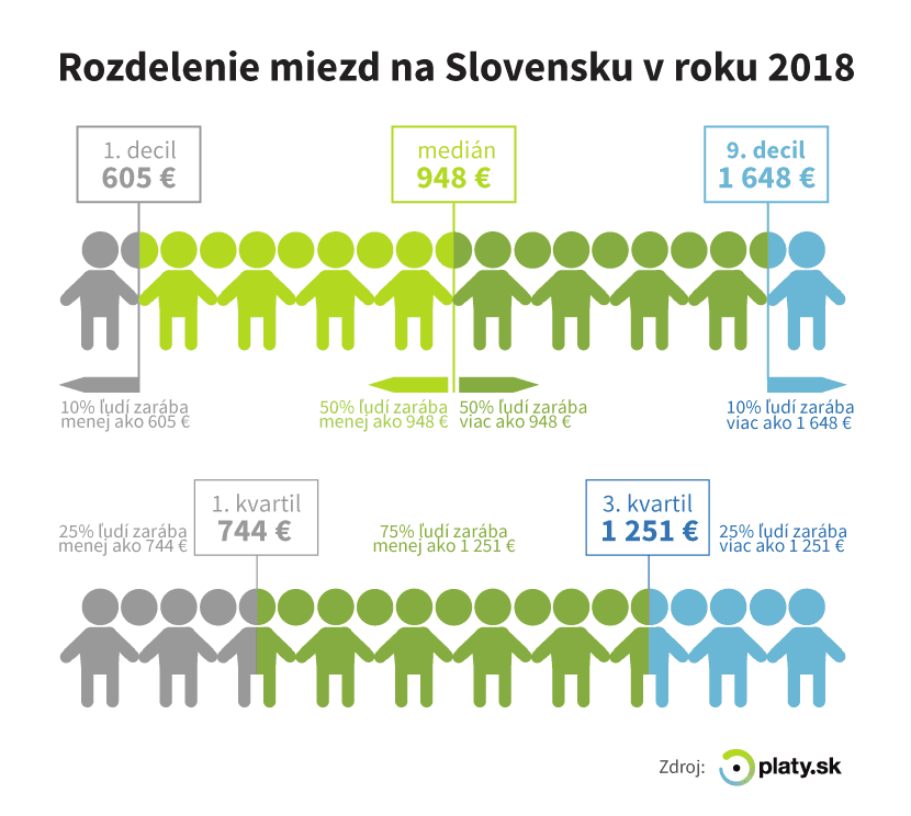 Najhoršia platená desatina Slovákov má plat nižší ako 605 eur v hrubom. Naopak, najlepšie platená desatina Slovákov zarába lepšie ako 1648 eur v hrubom.
