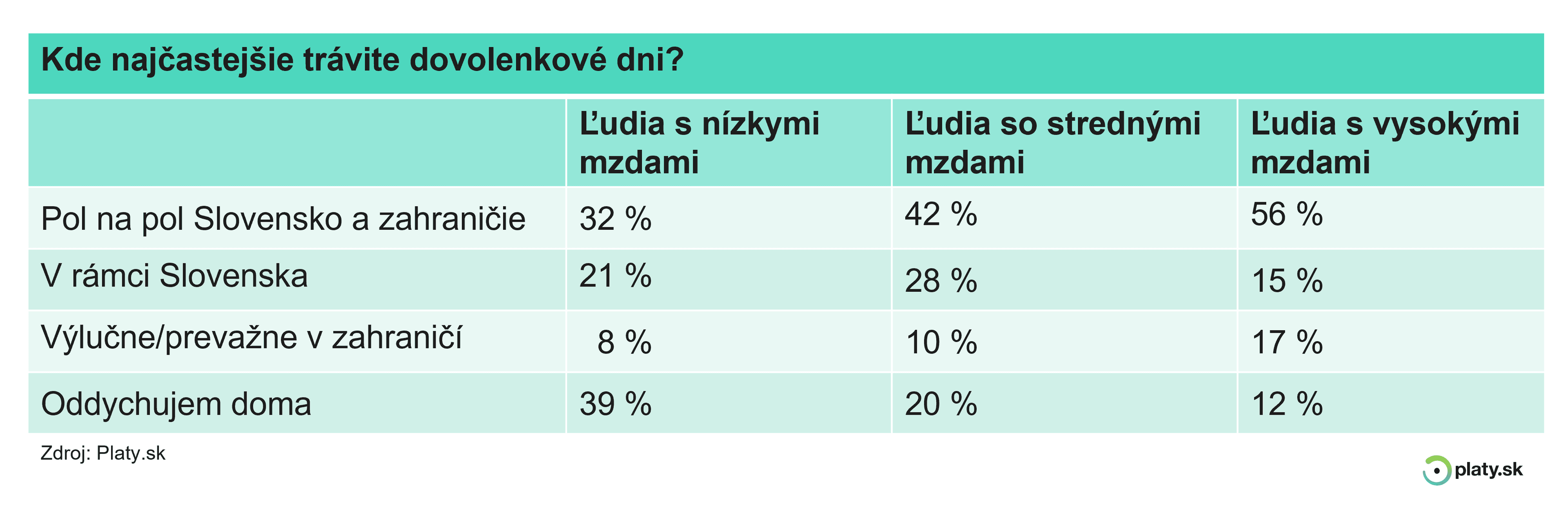 Hľadanie leteckých zájazdov či pobytov v našich horách nie je v možnostiach každého. To, kde zamestnanci a zamestnankyne pracujúci na Slovensku najčastejšie trávia dovolenku, sa výrazne líši podľa výšky príjmu. Najväčšia časť z tých, ktorí majú nízke mzdy, trávi dovolenkové dni oddychom doma, no tretina z nich volí výlety na Slovensku aj v zahraničí. Pre porovnanie, viac ako polovica zamestnancov s vysokými príjmami dovolenkuje na Slovensku aj za hranicami, druhá najčastejšia voľba je oddych primárne mimo Slovenska.