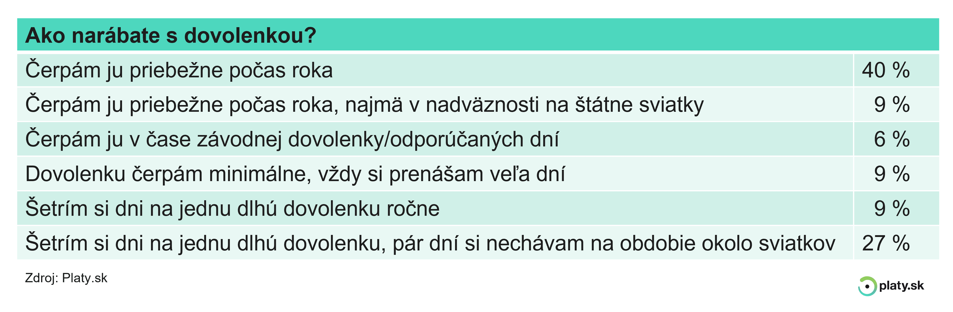 Zatiaľ čo polovica respondentov a respondentiek čerpá dovolenku priebežne počas roka, viac ako tretina si šetrí dni na jednu dlhú dovolenku ročne. Svoju úlohu zohrávajú aj štátne sviatky, týmto spôsobom si predlžuje voľno 9 percent respondentov. Spomedzi tých, ktorí dovolenkujú raz ročne, si väčšina pár dní necháva aj na obdobie okolo sviatkov.