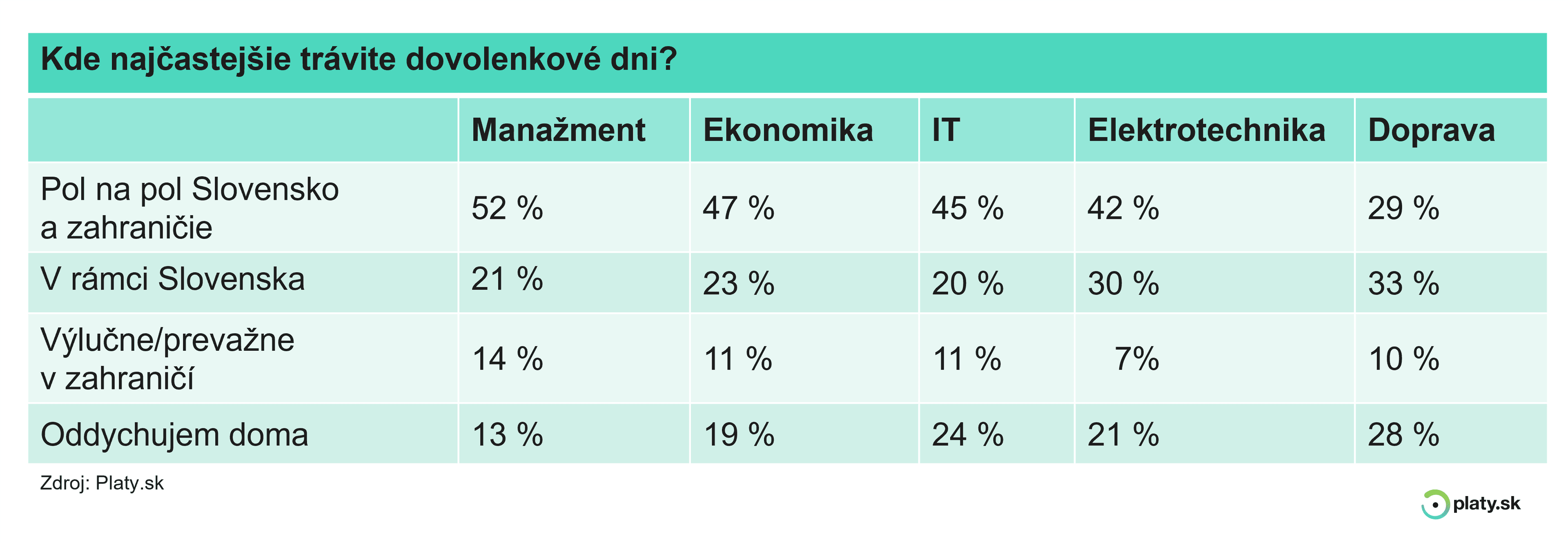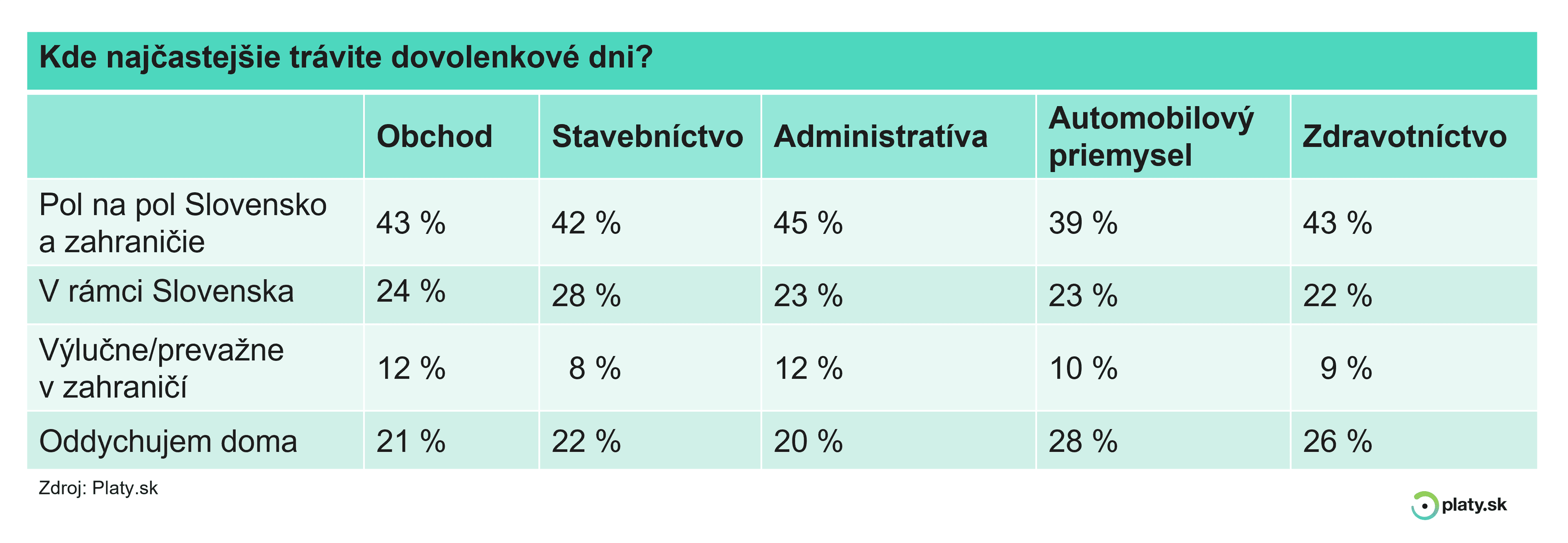 Z prieskumu vyplýva, že relaxu si doprajeme dostatok. Zamestnanci a zamestnankyne takmer všetkých sledovaných odvetví trávia dovolenku najčastejšie v rámci jedného roka na Slovensku aj v zahraničí, iba pre pracovníkov v doprave je najčastejšou voľbou Slovensko. Oddych doma volí viac ako štvrtina zamestnancov a zamestnankýň v zdravotníctve, automobilovom priemysle a doprave, naopak, túto možnosť využíva len 13 percent manažérov a manažérok, o percento menej ako tí z nich, ktorí chodia iba do zahraničia.
