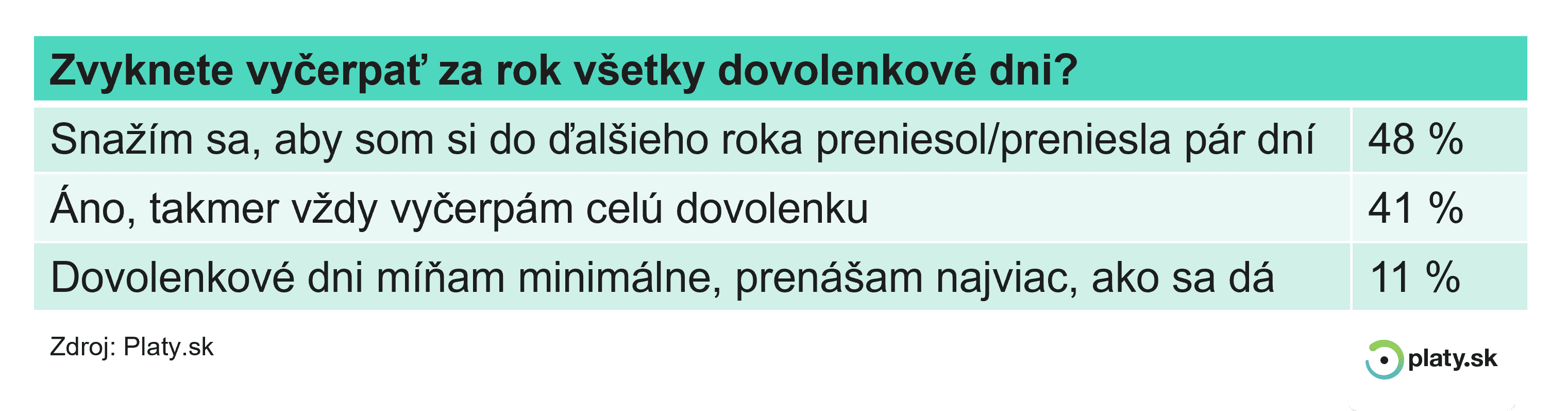 Z prieskumu tiež vyplynulo, že čím väčšia firma, tým častejšie jej zamestnanci využijú každoročne všetky dovolenkové dni. V tých s 1 000 a viac zamestnancami je to polovica pracovníkov a pracovníčok, v najmenších spoločnostiach, ktoré majú do 10 zamestnancov, je to len 35 percent.