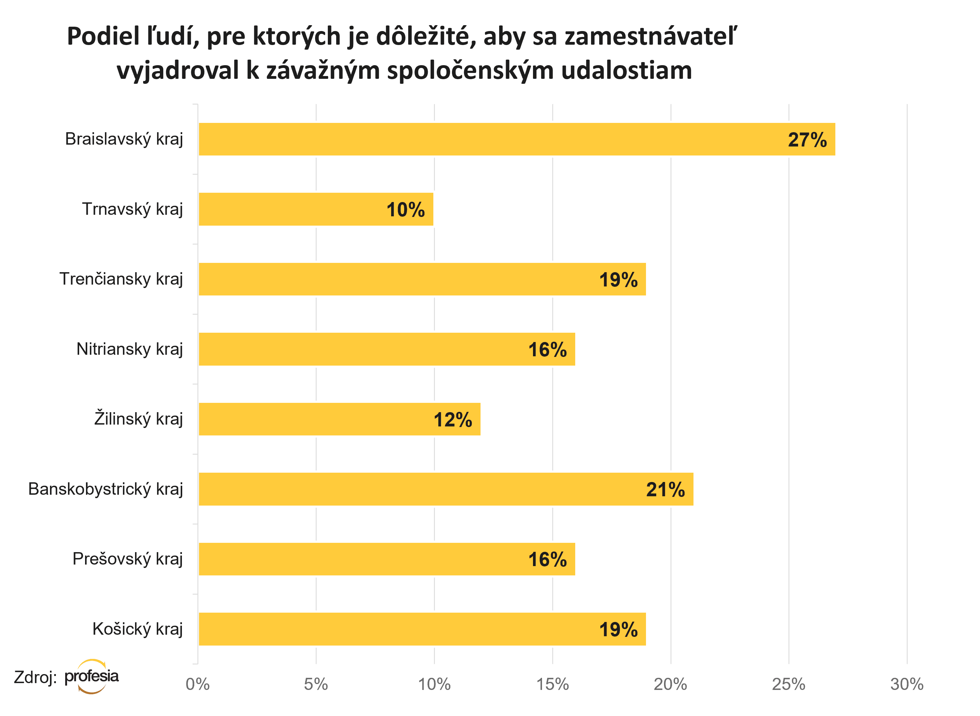 V Bratislavskom kraji je najväčšia časť zamestnankýň a zamestnancov, pre ktorých je dôležité, aby sa ich zamestnávateľ v prípade závažných udalostí vyjadril, tvrdí to 27 percent respondentov, tretina to vyslovene odmieta, zvyšným zamestnancom na tom nezáleží. Na opačnej strane sú pracujúci v Trnavskom kraji, otvorenosť zamestnávateľa v týchto situáciách je dôležitá len pre desatinu, viac ako dve tretiny to nechcú.