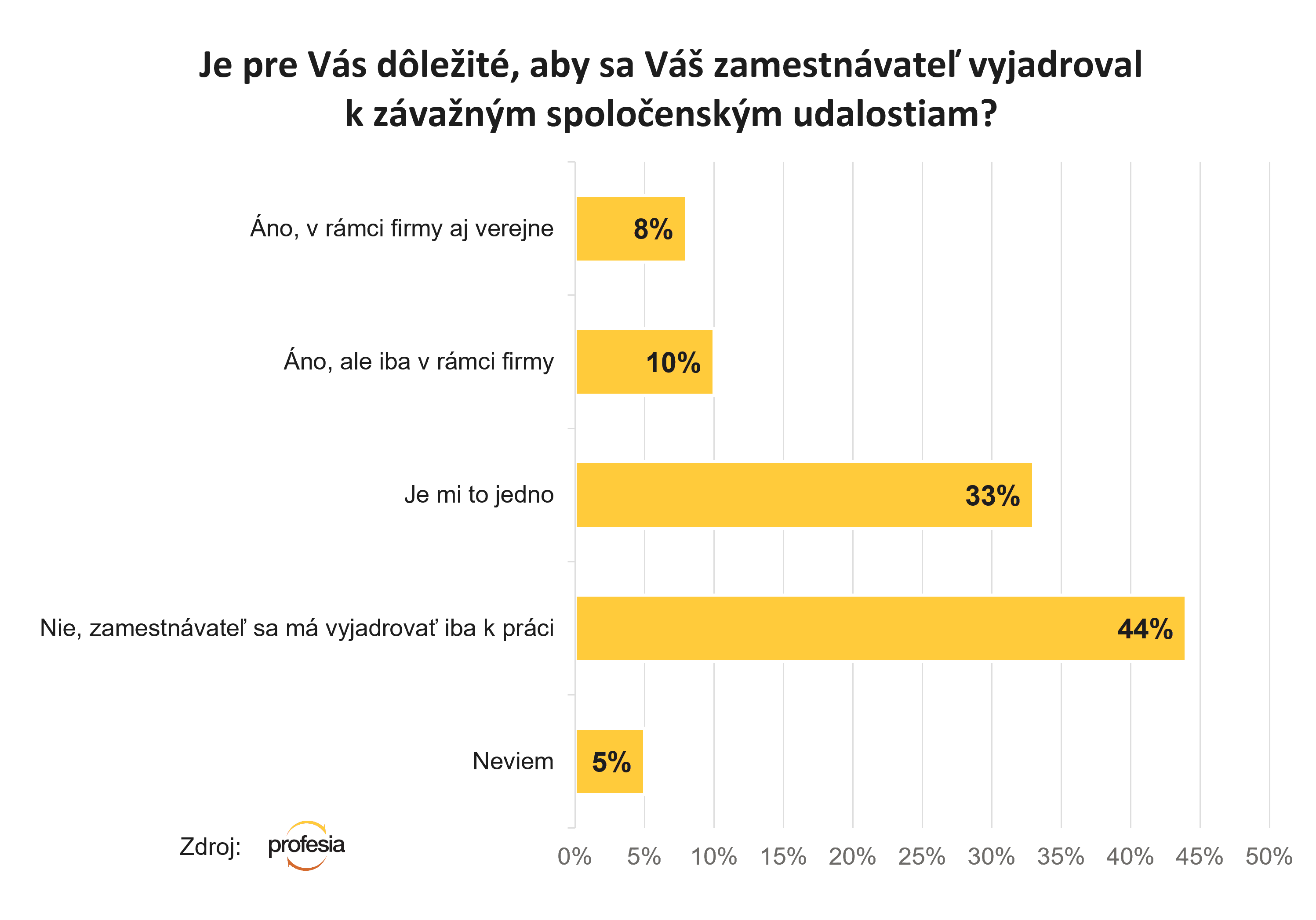 Iba 8 percent považuje za dôležité, aby sa ich zamestnávateľ vyjadril v rámci firmy aj verejne, podstatné je to aj pre ďalšiu desatinu, ktorá však žiada, aby to ostalo iba interne vo firme. Tretine na tom nezáleží.
