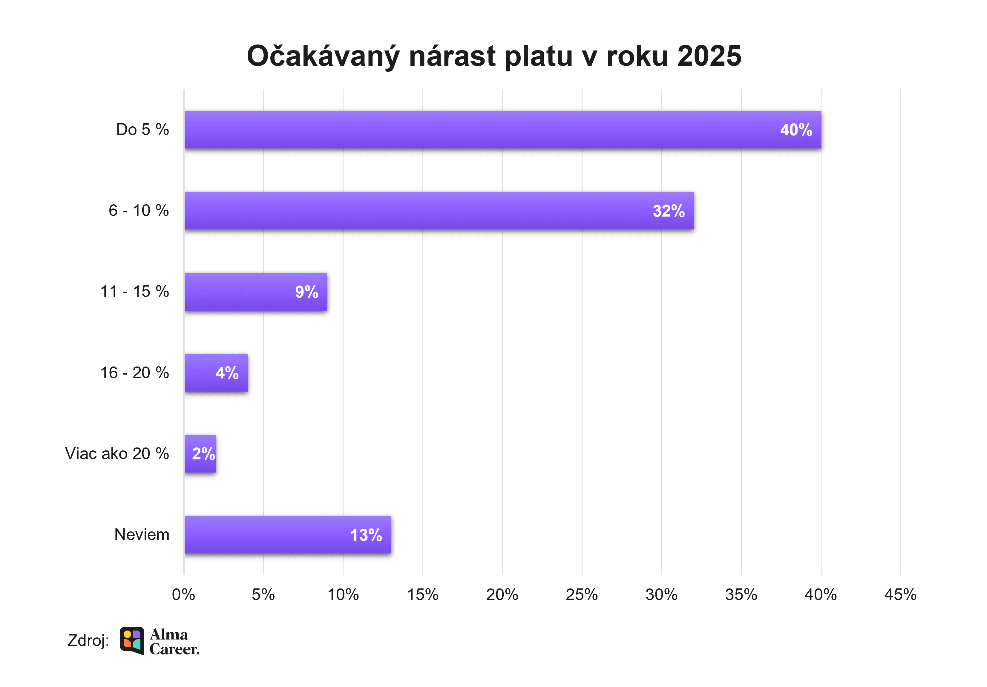 Predstavy zamestnankýň a zamestnancov o raste platu nie sú prehnané. Spomedzi tých, ktorí na budúci rok očakávajú zvýšenie, 40 percent predpokladá, že ich príjem bude vyšší do 5 percent. Tretina si myslí, že rast ich platu bude medzi 6 a 10 percentami. Iba 2 percentá očakávajú zvýšenie nad 20 percent.