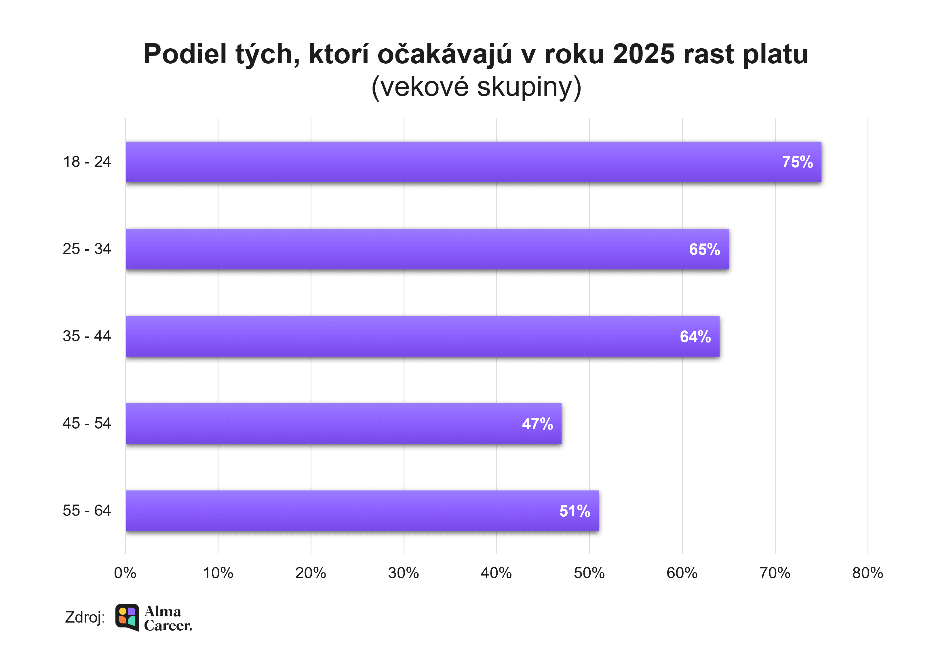 Najviac očakáva zvýšenie zárobku najmladšia skupina na trhu práce. Až tri štvrtiny respondentov vo veku od 18 do 24 rokov predpokladajú v roku 2025 rast svojho platu. V prípade ľudí starších ako 50 rokov je to približne polovica.