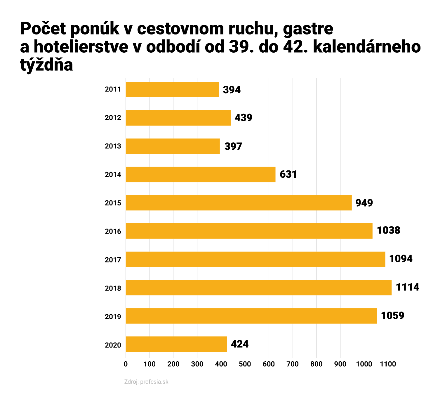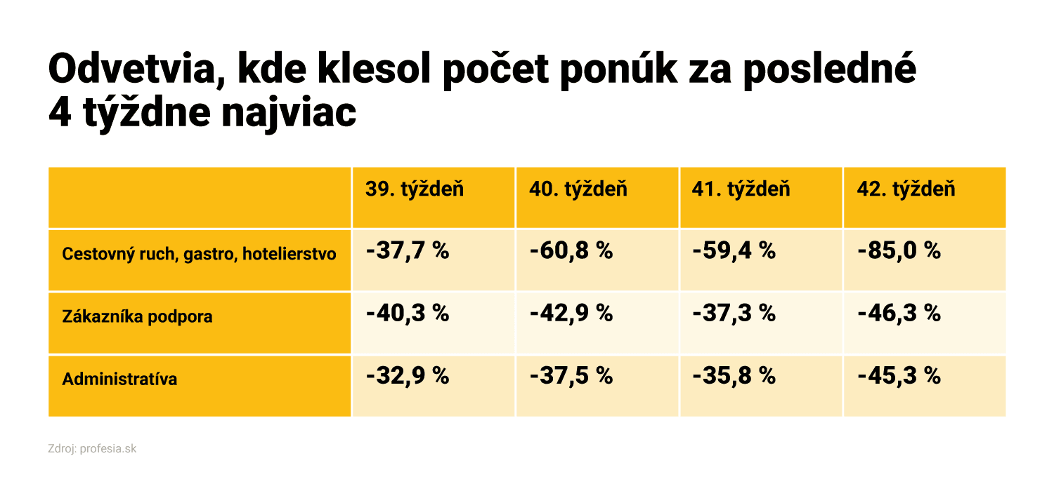 Odvetvím, v ktorom medziročne najviac klesol počet ponúk za posledné 4 týždne, je cestový ruch, gastro a hotelierstvo. Počas 39. kalendárneho týždňa išlo oproti vlaňajšku o zhruba 38 percentný prepad. Odvtedy situácia už len zhoršuje.