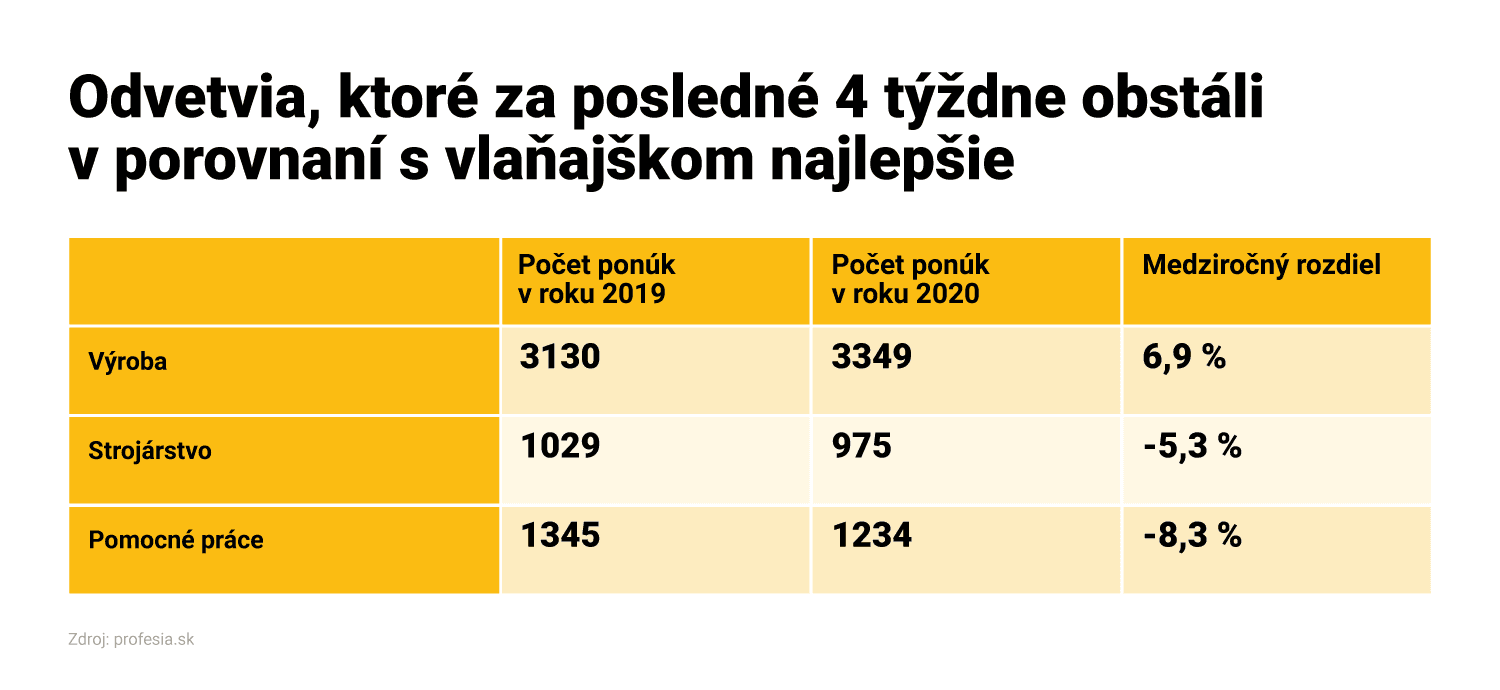 Okrem výroby obstávajú v porovnaní s vlaňajškom pomerne dobre aj strojárstvo a pomocné práce. Napriek tomu, že v oboch prípadoch eviduje Profesia medziročný pokles v počte ponúk, ani v jednom prípade nie je prepad za posledné štyri týždne vyšší ako desať percent.