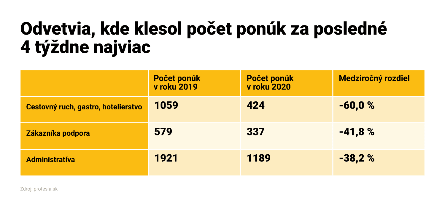 Okrem spomínaného cestovného ruchu a gastra klesla ponuka výrazne aj v ďalších dvoch sektoroch. V prípade zákazníckej podpory eviduje najväčší pracovný portál na Slovensku medziročný prepad až 42 percent. Za posledné štyri kalendárne týždne pribudlo v tomto odvetví 337 pracovných ponúk. Vlani to bolo až o 242 inzerátov viac.