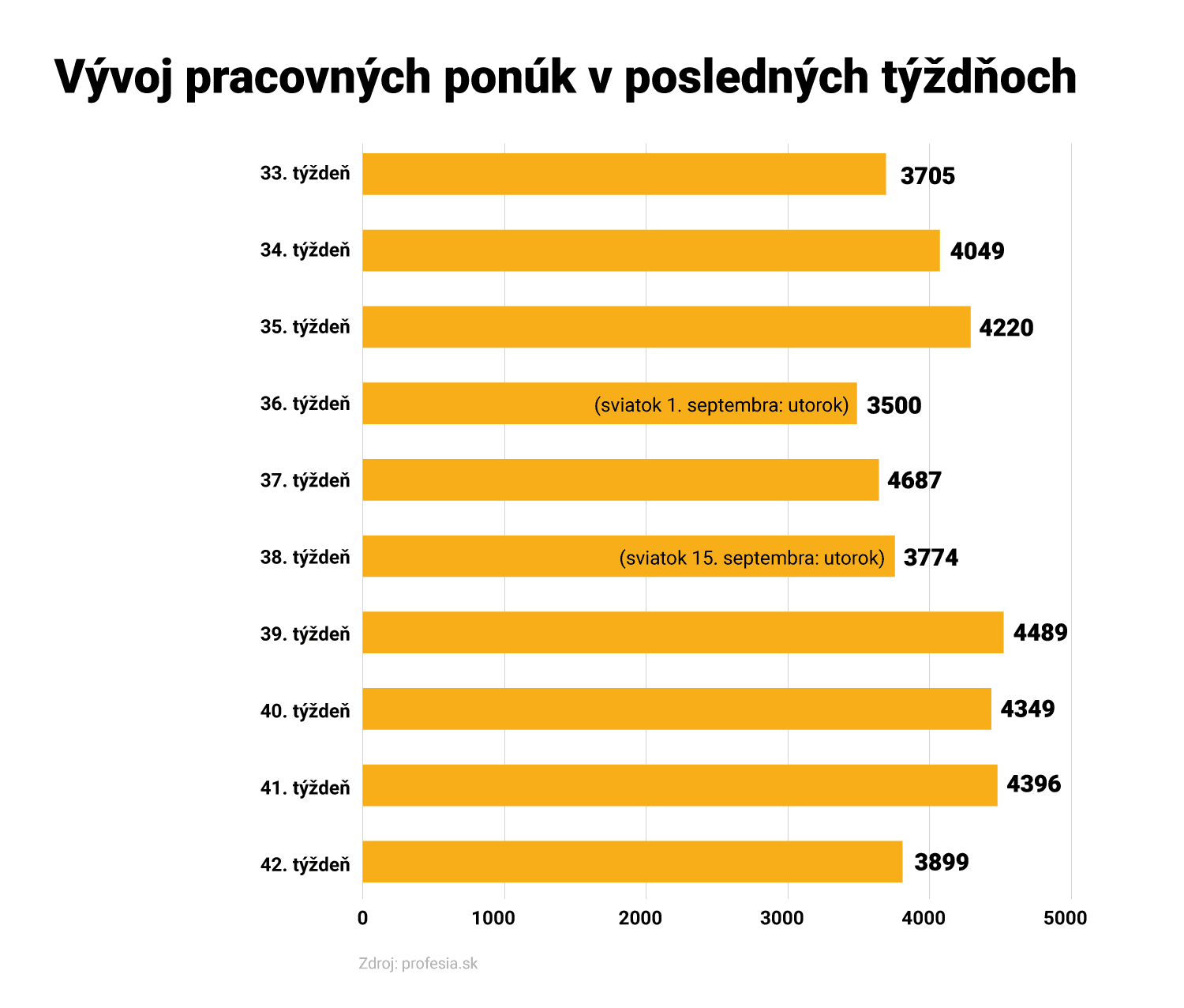 Počas 42. kalendárneho týždňa uverejnili zamestnávatelia na pracovný portál Profesia.sk 3899 nových pracovných ponúk. Počet inzerátov bol od pondelka 12. do nedele 18. októbra 2020 približne o 500 nižší ako predošlý týždeň.