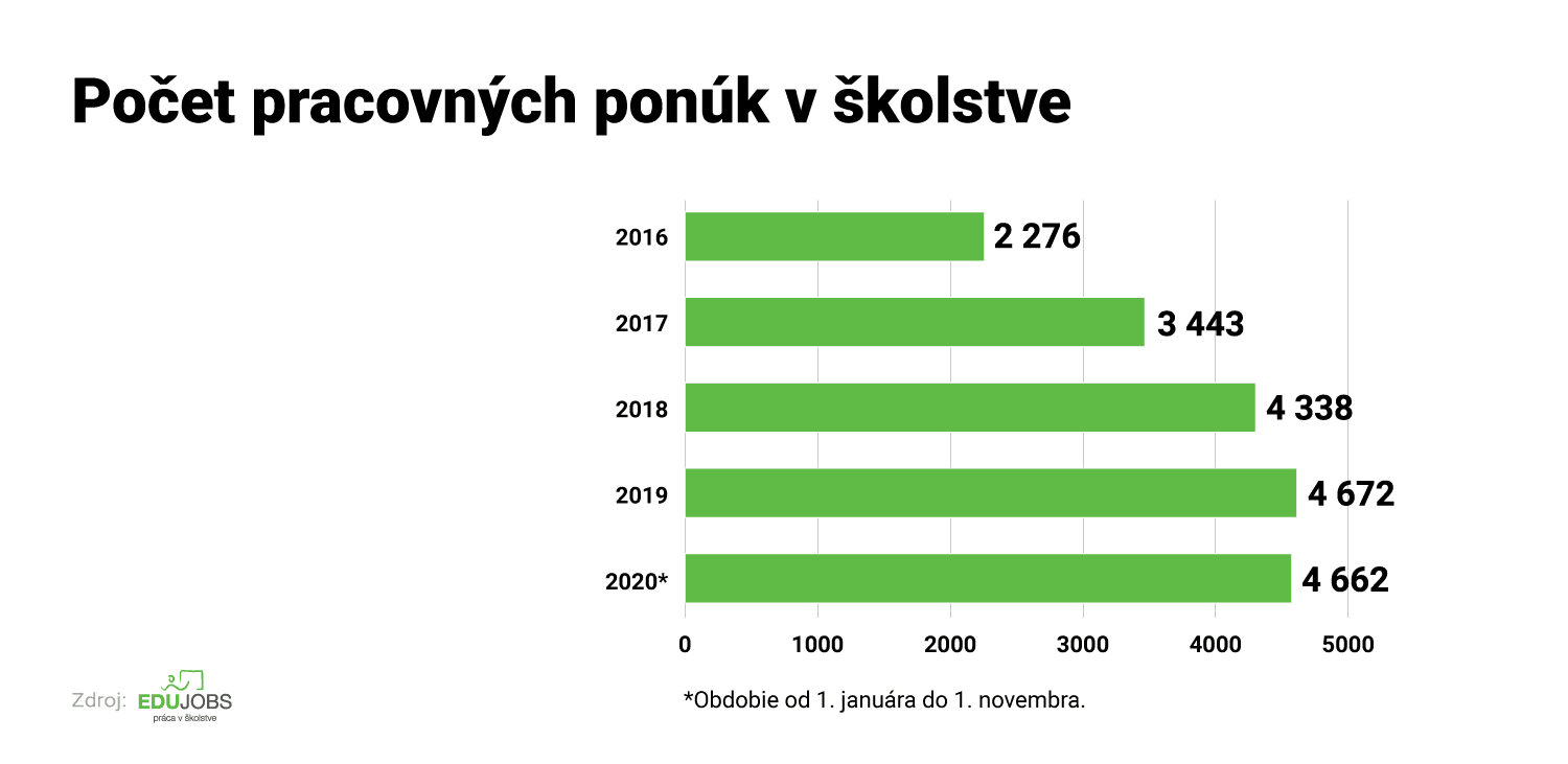 Portál Edujobs.sk evidoval od januára do začiatku novembra až 4662 pracovných ponúk v školstve. Záujem slovenských škôl o nových ľudí každý rok stúpa.
