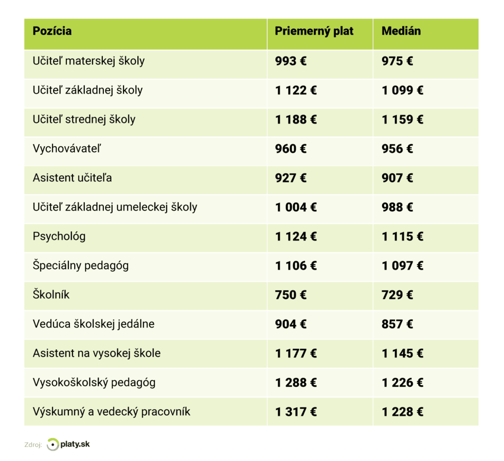 Priemerná hrubá mesačná mzda asistenta/ky učiteľa je len 927 eur. Priemerný plat vychovávateliek či učiteliek v škôlkach sa pohybuje na úrovni približne 960 eur. Učiteľ/ka základnej školy v priemere zarobí 1 122 eur, učiteľ/ka strednej školy 1 188 eur. Najlepšie si v školstve zarobia pedagógovia na vysokej škole. Priemerný plat vysokoškolského pedagóga je 1 288 eur, výskumného a vedeckého pracovníka 1 317 eur.