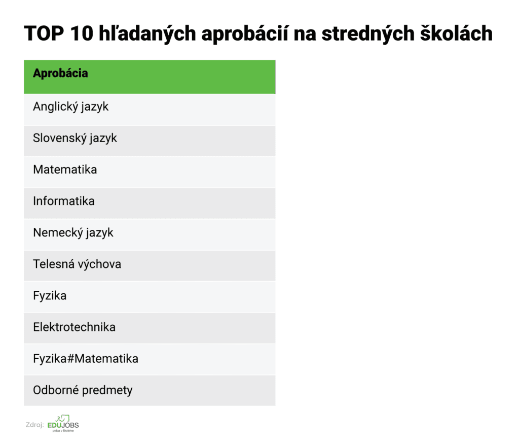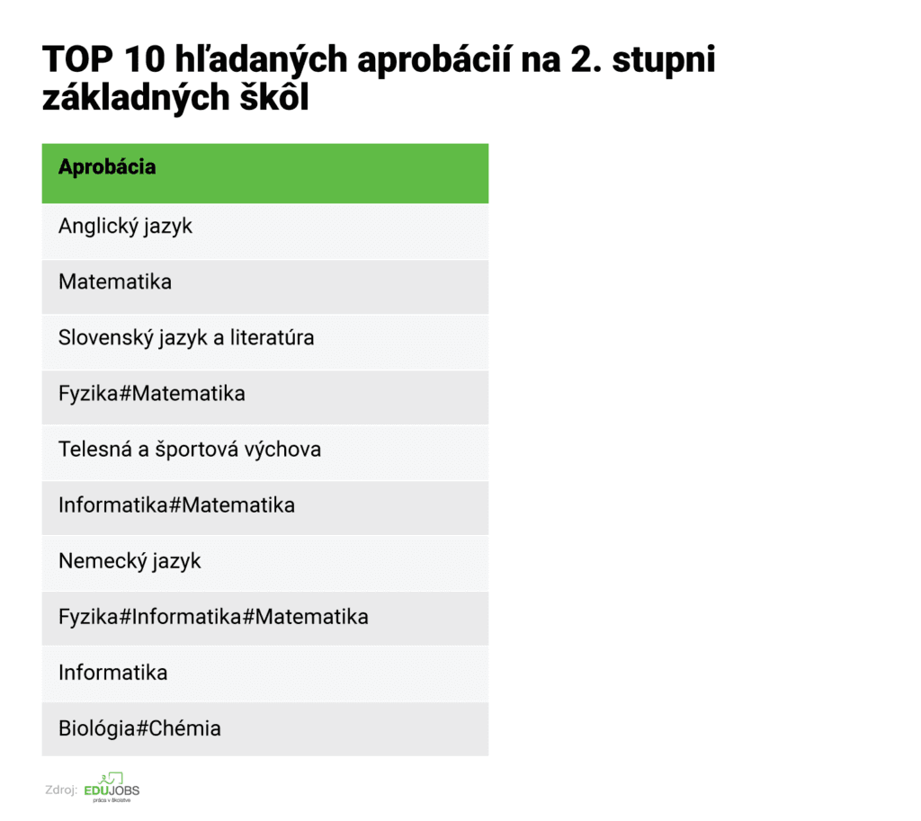 Na druhom stupni základných škôl hľadali najmä učiteľov/učiteľky anglického jazyka, matematiky, slovenského jazyka, pedagógov s kombináciou matematika a fyzika, prípadne telocvikárov. Na stredných školách bolo počas minulého roka najviac ponúkaných pozícií učiteľom anglického jazyka, slovenského jazyka, matematiky, informatiky a nemeckého jazyka.