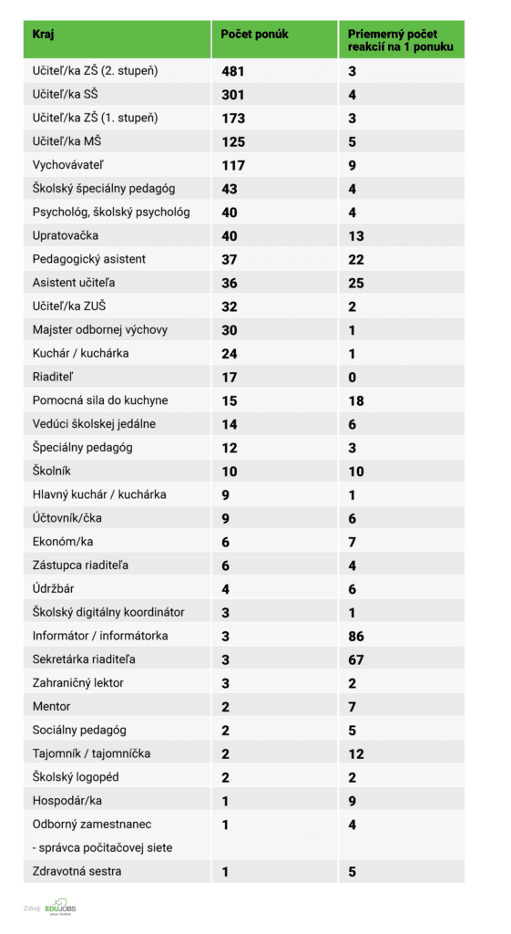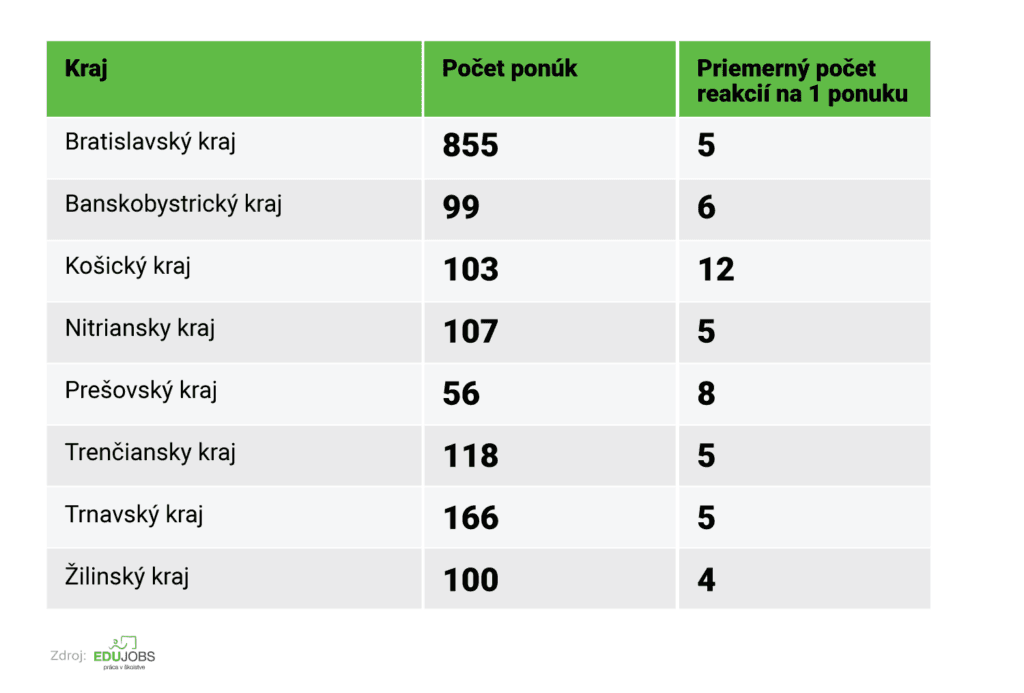 Najviac pracovných ponúk v oblasti školstva záujemcovia nájdu v Bratislavskom kraji. Momentálne je v ňom voľných 855 pracovných miest. V Trenčianskom kraji hľadajú 118 pracovníkov a pracovníčok, v Trnavskom kraji je otvorených 166 príležitostí zamestnať sa v školstve. Najvyšší záujem o pracovné miesta vo vzdelávaní pozorujeme v Košickom kraji. Na jedno ponúkané miesto tam reaguje v priemere 12 záujemcov.