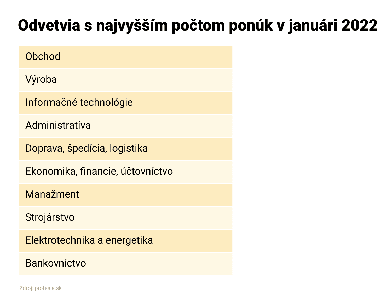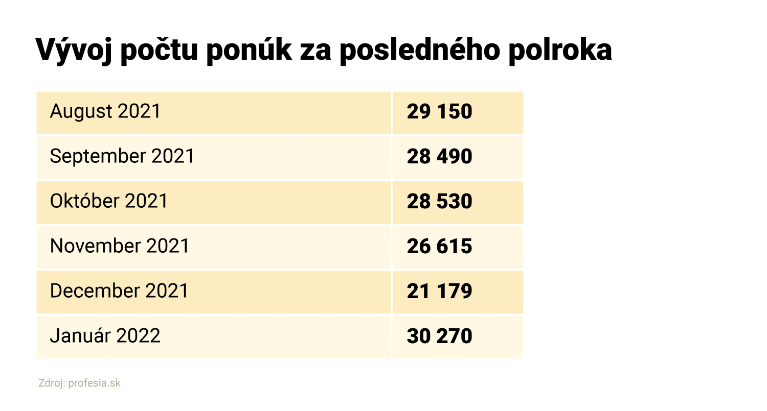 Vlaňajšok bol pre trh práce doteraz rekordným. Najvyšší počet ponúk prišiel v auguste, keď firmy uverejnili viac ako 29-tisíc ponúk. Rekord z minulého leta je však už oficiálne prekonaný. Január 2022 priniesol celkovo až 30 270 pracovných inzerátov.