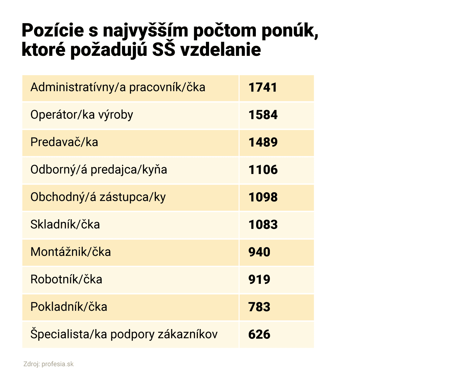 Spomedzi pracovných príležitostí, ktoré sú vhodné pre uchádzačov so stredoškolským vzdelaním, išlo najčastejšie o ponuky práce na administratívnych pracovníkov a pracovníčky, operátorov/riek výroby a predavačov či predavačky.