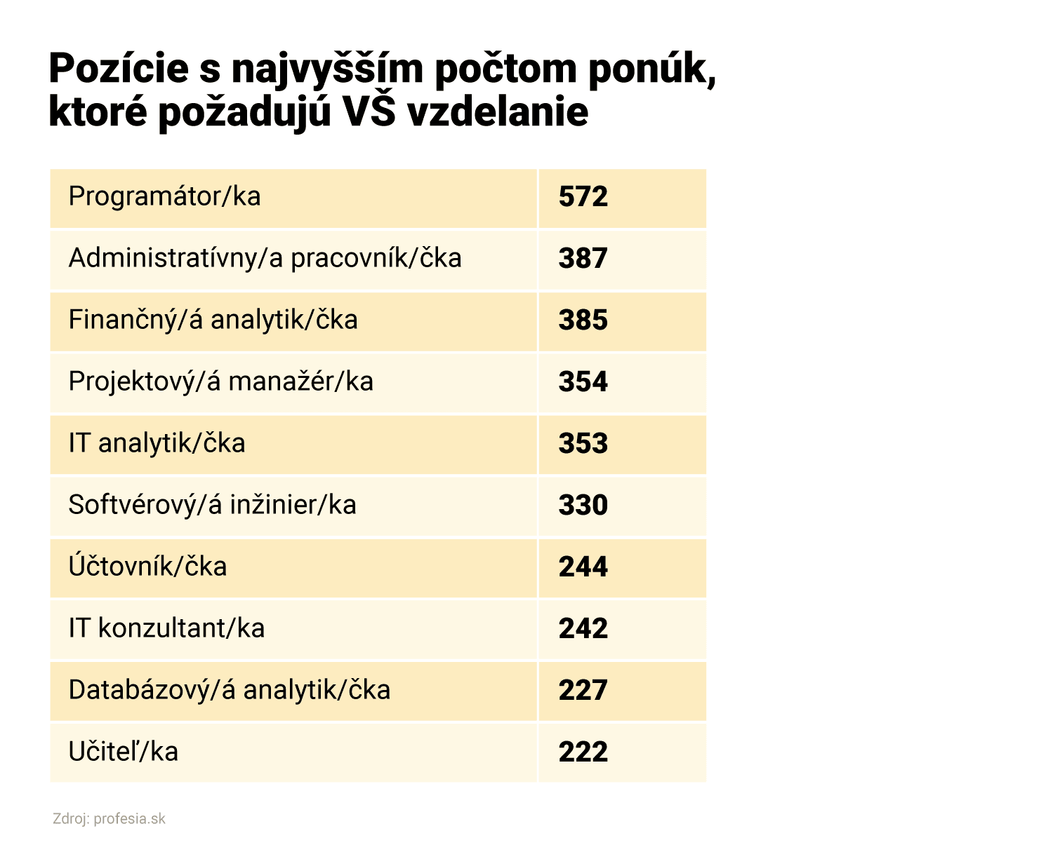 Programátor/ka, administratívny/a pracovník/čka či finančný analytik a analytička. Toto sú pozície, na ktoré eviduje najväčší pracovný portál na Slovensku najviac ponúk, ktoré požadujú vysokoškolské vzdelanie.