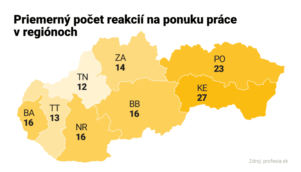 Opačnú situáciu treba hľadať na východnom Slovensku. Priemerný počet odoslaných životopisov na jednu pracovnú ponuku tu predstavuje viac ako 20. V Prešovskom kraji zareaguje na pracovný inzerát v priemere 23 a v Košickom kraji až 27 ľudí.