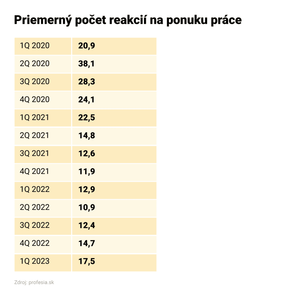 Prvý štvrťrok 2023 priniesol čísla, ktoré mohli tešiť aj zamestnávateľov. Po dvoch rokoch sa zvýšil počet reagujúcich uchádzačov na pracovné ponuky. Aktuálne platí, že na jeden pracovný inzerát, ktorí bol uverejnení na Profesia.sk, zareagovalo v priemere takmer 18 ľudí.