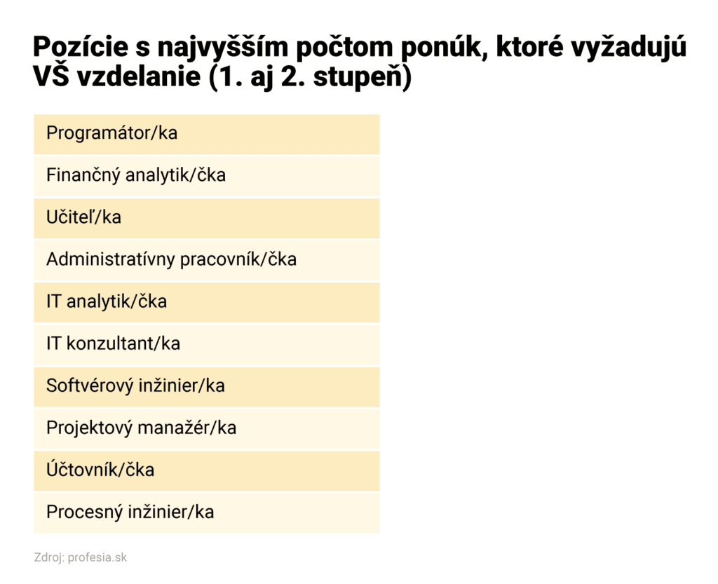 Spomedzi titulovaných ľudí potrebujú firmy najviac nových zamestnancov na pozície programátorov a programátoriek, finančných analytikov a analytičiek či učiteľov a učiteliek.