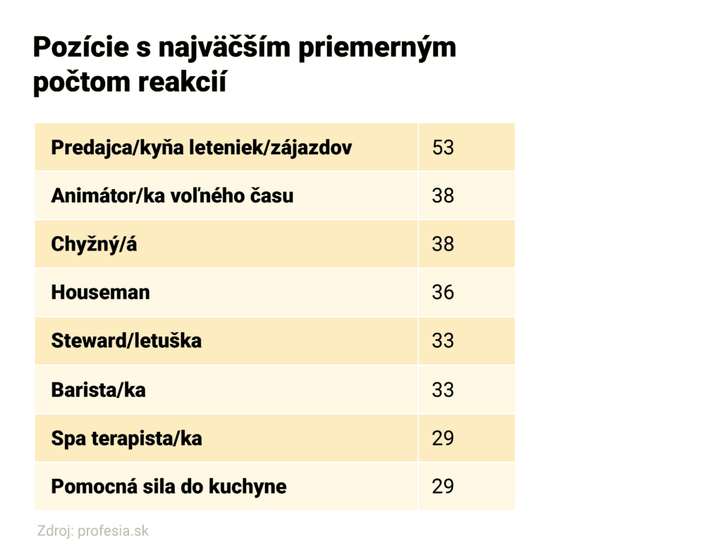 Zatiaľ čo pred začiatkom pandémie bola pre uchádzačov o prácu najzaujímavejšia pozícia predajcu/predajkyne leteniek a zájazdov, a veľký dopyt bol aj po práci letušiek a stewardov, keď sa cestovanie do zahraničia na istú dobu prakticky zastavilo, na atraktivite nabralo povolanie sprievodcu a sprievodkyne v cestovnom ruchu. Tento rok je opäť najväčší priemerný počet reakcií na ponuky pre predajcov leteniek a zájazdov. Na jeden inzerát reaguje v priemere až 53 ľudí.