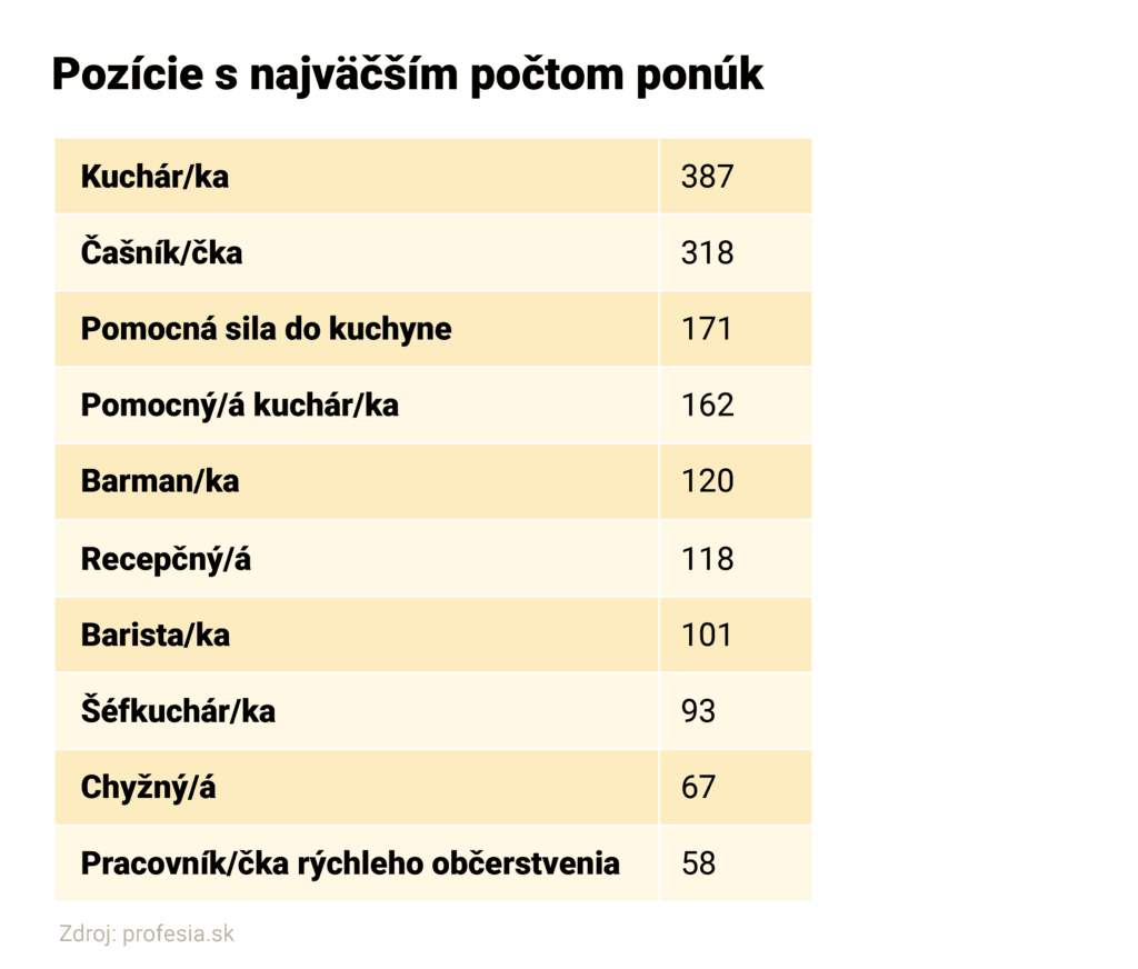 Aktuálne hľadajú firmy z oblasti gastra, cestovného ruchu a hotelierstva najviac kuchárov, na Profesia.sk je aktívnych takmer 400 ponúk. 40 percent z nich je v Bratislavskom kraji, viac ako 50 kuchárov a kuchárok hľadajú aj v Žilinskom kraji. Dopyt je aj po čašníkoch a čašníčkach, ktorých momentálne hľadajú viac ako 300.