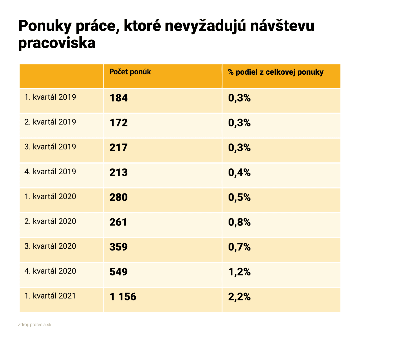 Dva roky dozadu uverejnili zamestnávatelia za prvý štvrťrok len 184 pracovných ponúk na prácu na diaľku. Nešlo o inzeráty, ktoré poskytovali možnosť odpracovať niektoré dni aj z domu, ale o stále zamestnanie na diaľku, ktoré vôbec nevyžadovalo príchod na pracovisko. Analýza portálu Profesia.sk informuje, že počet takýchto ponúk odvtedy narástol na desaťnásobok.
