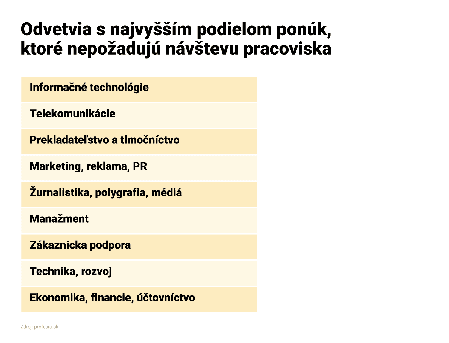 Po IT sú ponuky na diaľku najčastejšie v telekomunikáciách, prekladateľstve, marketingu či žurnalistike.