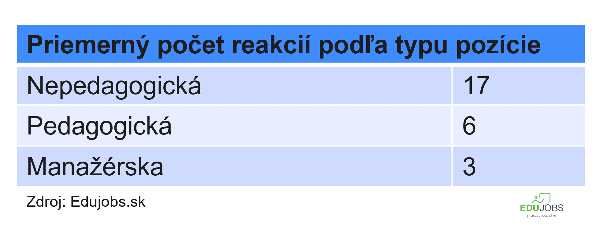 Spomedzi pedagogických pozícií je najväčší záujem o prácu pedagogických asistentov a asistentiek, na tieto ponuky v priemere reaguje viac ako 40 ľudí. Dôvodom je nižšie požadované vzdelanie. Priemerne 15 ľudí reaguje na ponuky pre vychovávateľky a vychovávateľov.