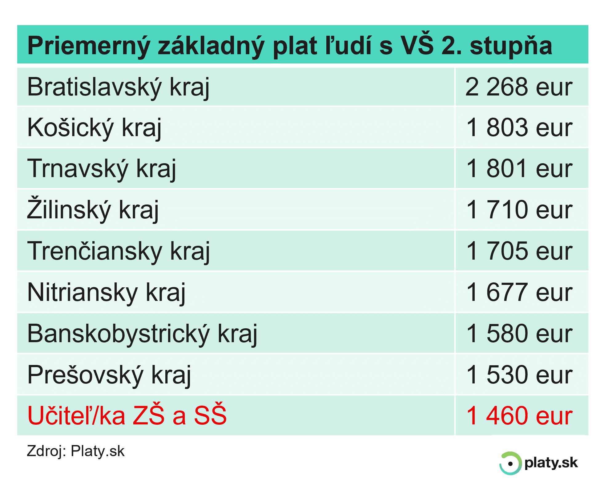 Z dát portálu Platy.sk vyplýva, že priemerný základný mesačný plat učiteľa na základných a stredných školách je 1 460 eur. V porovnaní s priemerným platom ľudí s vysokoškolským vzdelaním 2. stupňa je to o 500 eur menej. Najmenší rozdiel je v Prešovskom kraji, kde majú vysokoškolsky vzdelaní ľudia priemerný základný plat 1 530 eur, no v Bratislavskom je už rozdiel priepastný, 800-eurový.