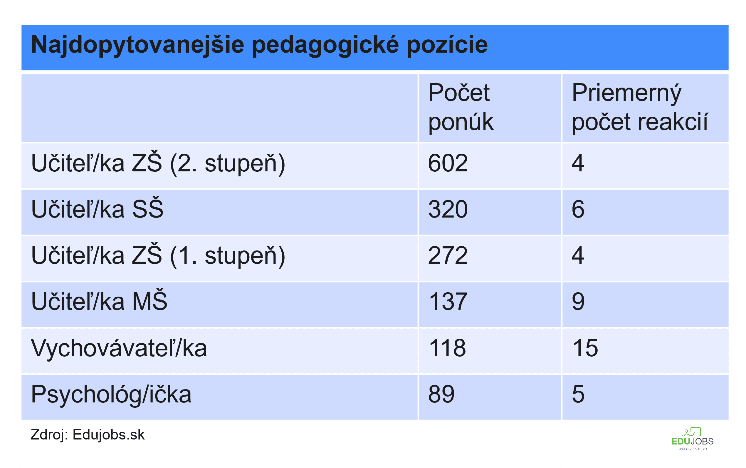 Väčšina z týchto ponúk je z verejných škôl. V medziročnom porovnaní prvých 5 mesiacov bolo na Edujobs.sk zverejnených o 330 ponúk pre učiteľky a učiteľov na základné a stredné školy viac ako vlani. Aktuálne ich hľadajú 1 200. Záujem zo strany uchádzačiek a uchádzačov o prácu je stále výrazne podpriemerný, na inzeráty na učiteľov a učiteľky na základné školy reagujú v priemere 4 ľudia, na ponuky na stredné školy príde v priemere 6 životopisov.