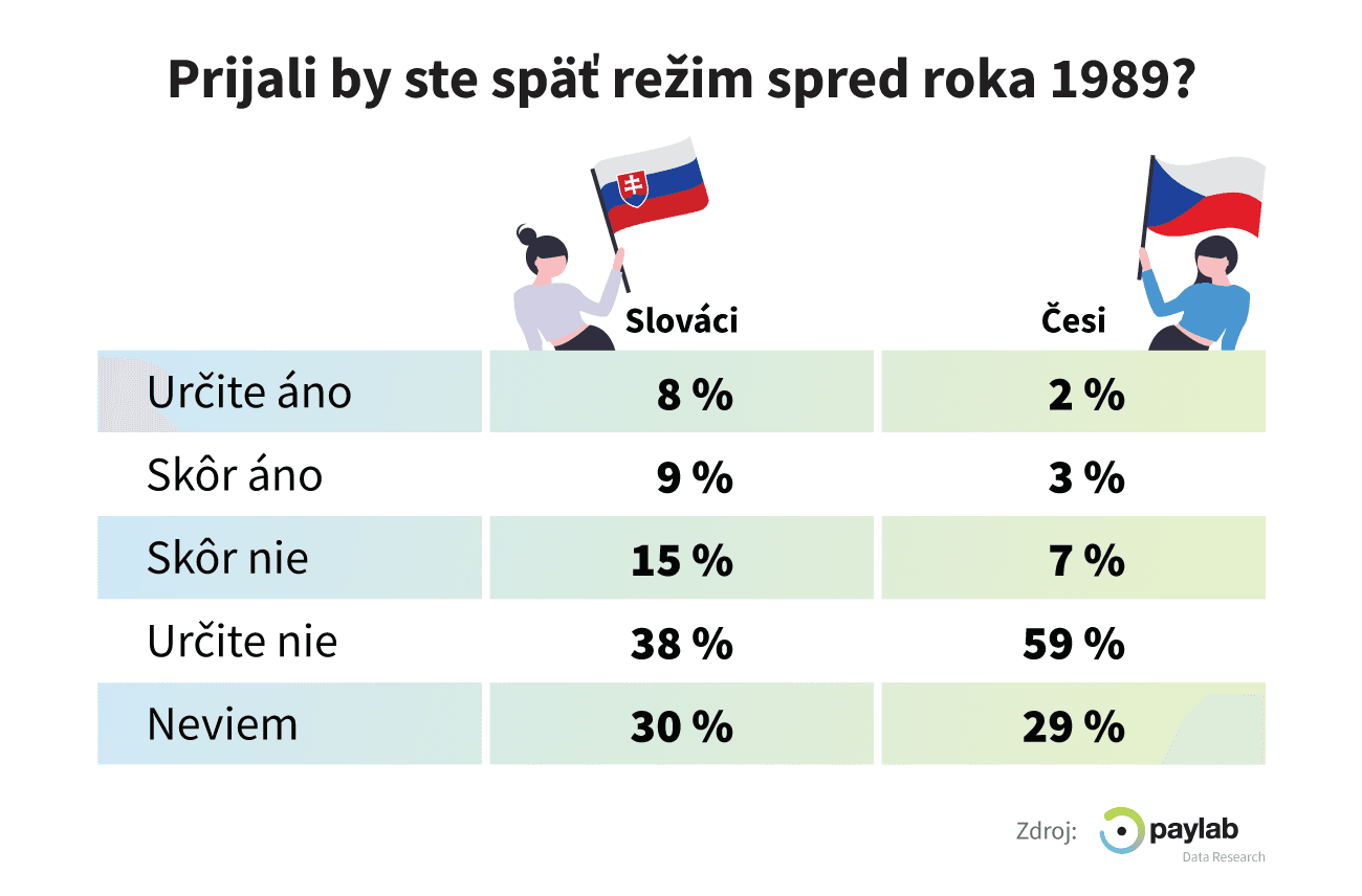 17 percent. Toľko Slovákov uviedlo, že by si prijalo späť bývalý režim. Keď sa pozrieme na odpovede našich susedov, za návrat bolo iba 5 percent odpovedajúcich.