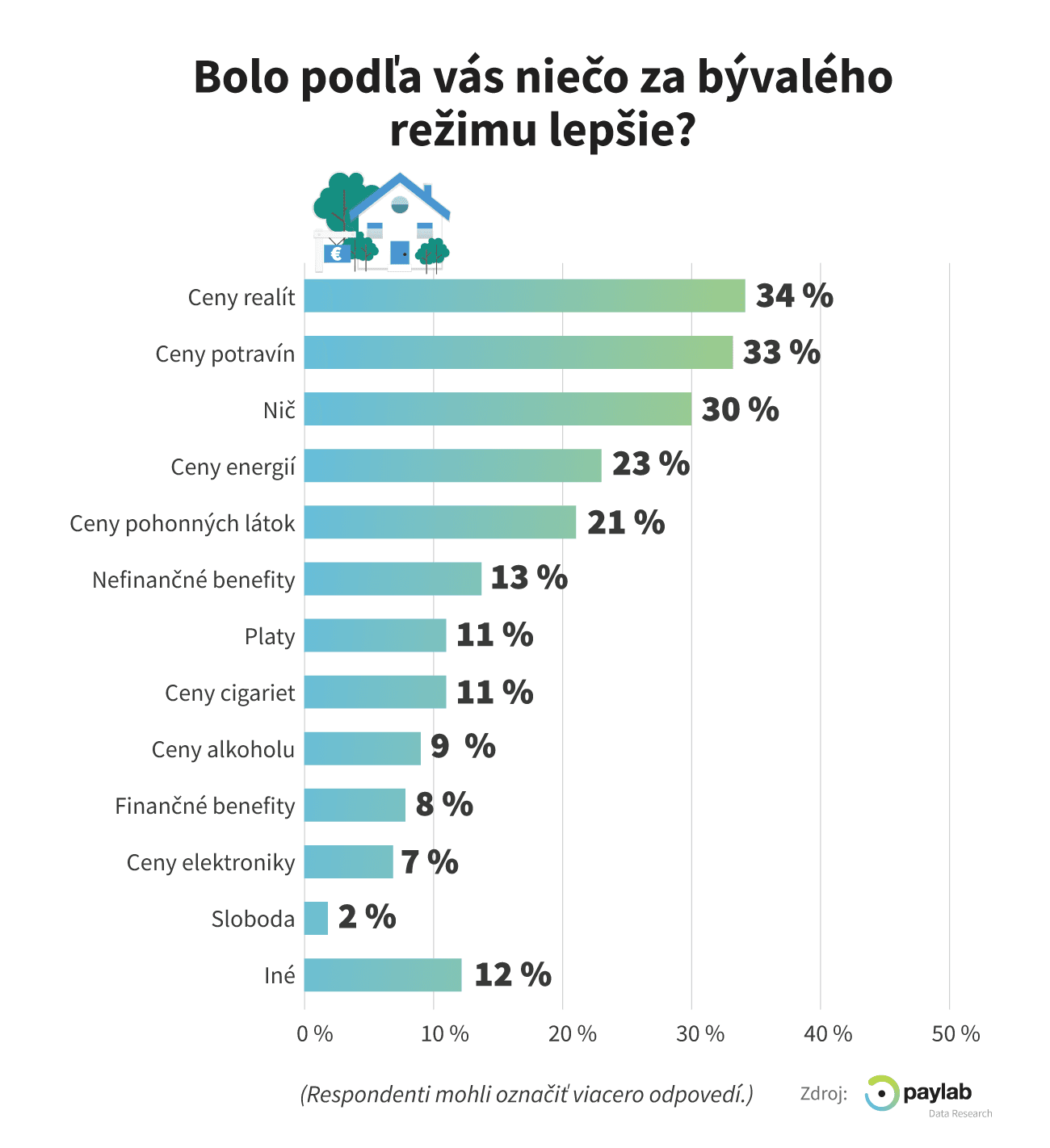 Tretina respondentov tvrdí, že pred revolúciou v roku 1989 boli na Slovensku nižšie ceny realít a potravín. Ľudia tiež označovali vtedajšie výhodnejšie ceny energií, pohonných látok či zaujímavejšie nefinančné benefity.