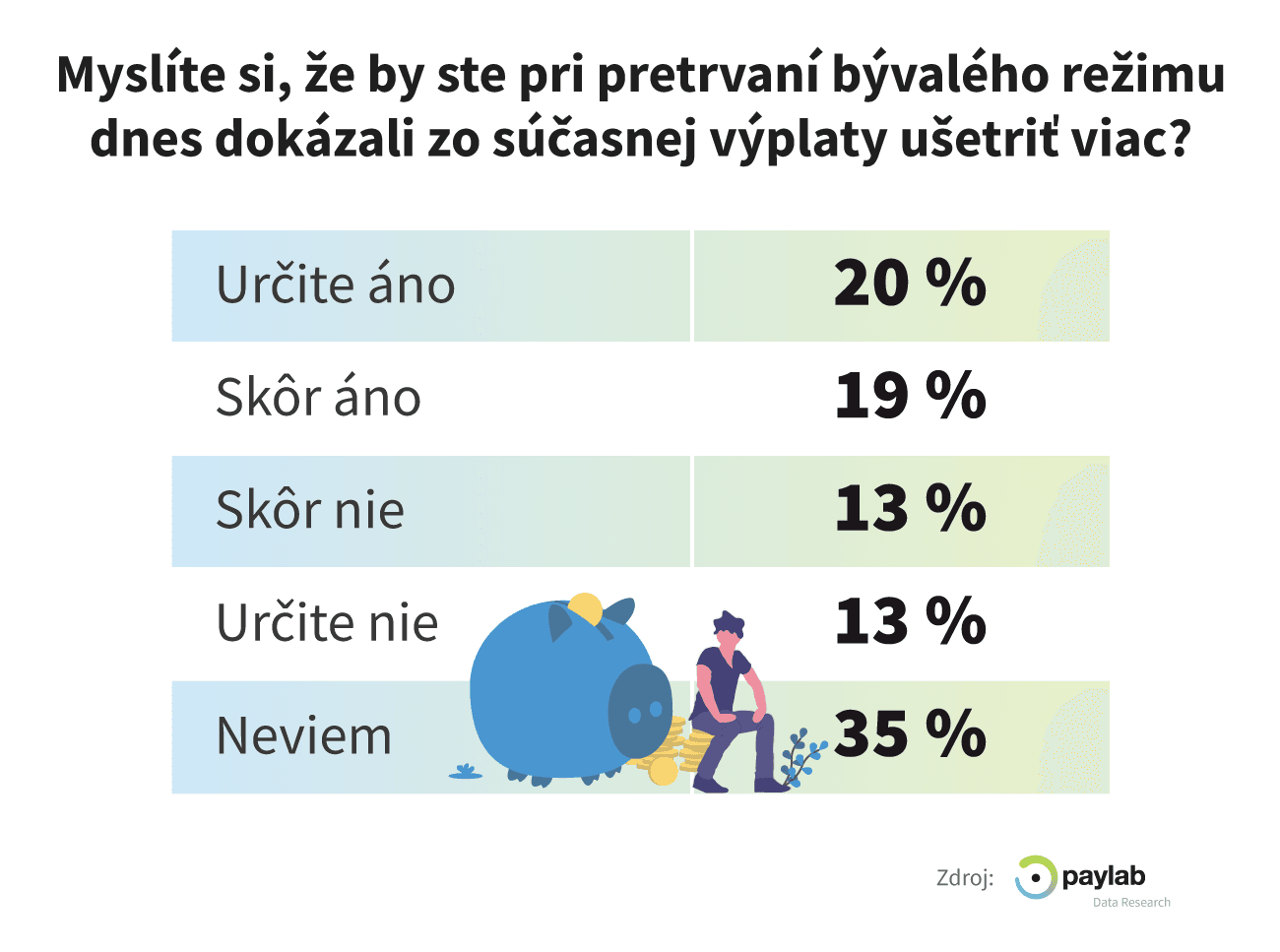 Z odpovedí respondentov vyplynulo, že zmena systému priniesla náročnejšie časy pre šetriacich ľudí. Takmer 40 percent slovenských respondentov tvrdí, že by si pri pretrvaní socializmu dokázali dnes ušetriť viac.