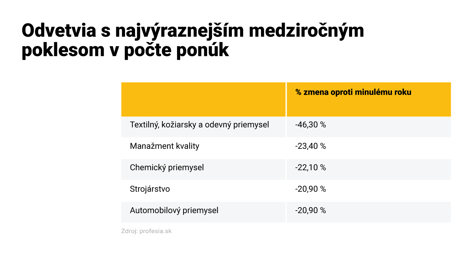 O viac ako pätinu klesol tiež počet ponúk v manažmente kvality, chemickom priemysle, strojárstve a automobilovom priemysle.