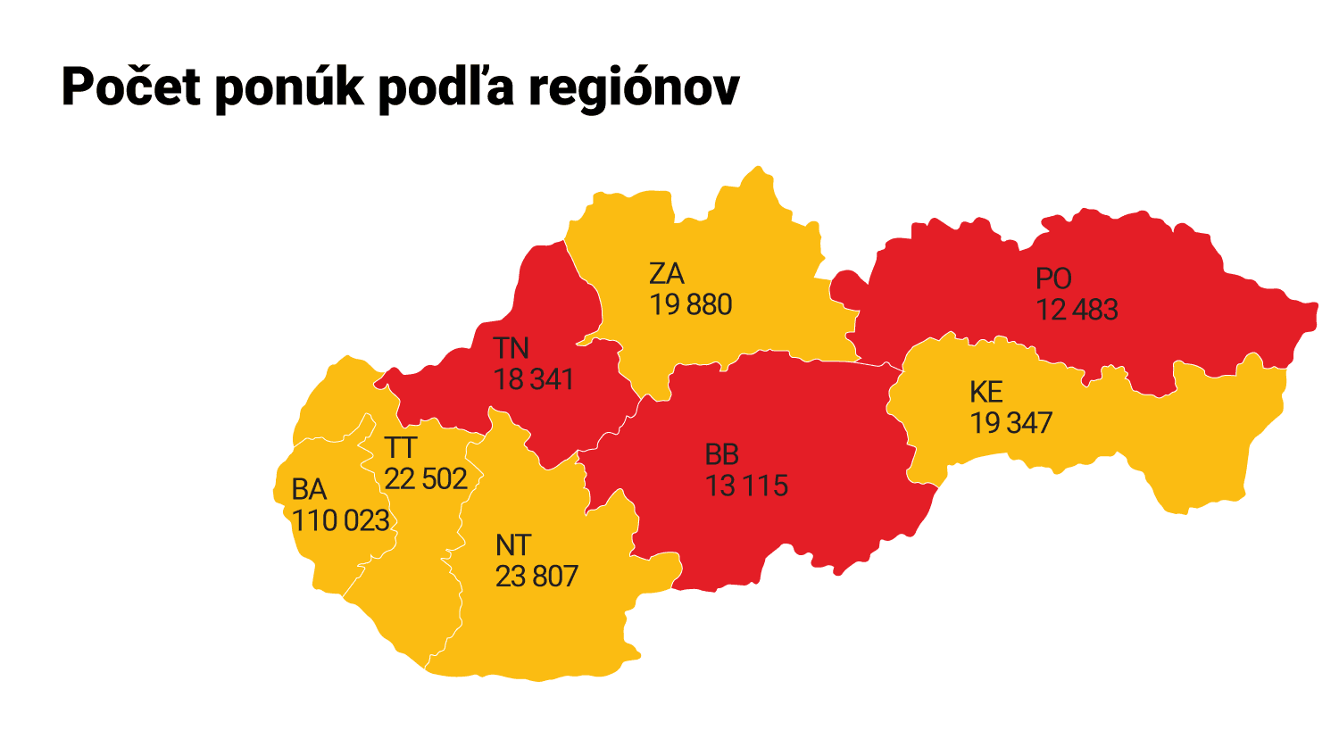 Kde je hľadanie práce najjednoduchšie? Pri pohľade na mapu Slovenska je jasné, že počet pracovných príležitostí v hlavnom meste je výrazne vyšší ako v hociktorom inom regióne. Ponuky v Bratislavskom kraji tvoria až 42 percent z celkového počtu pracovných príležitostí.