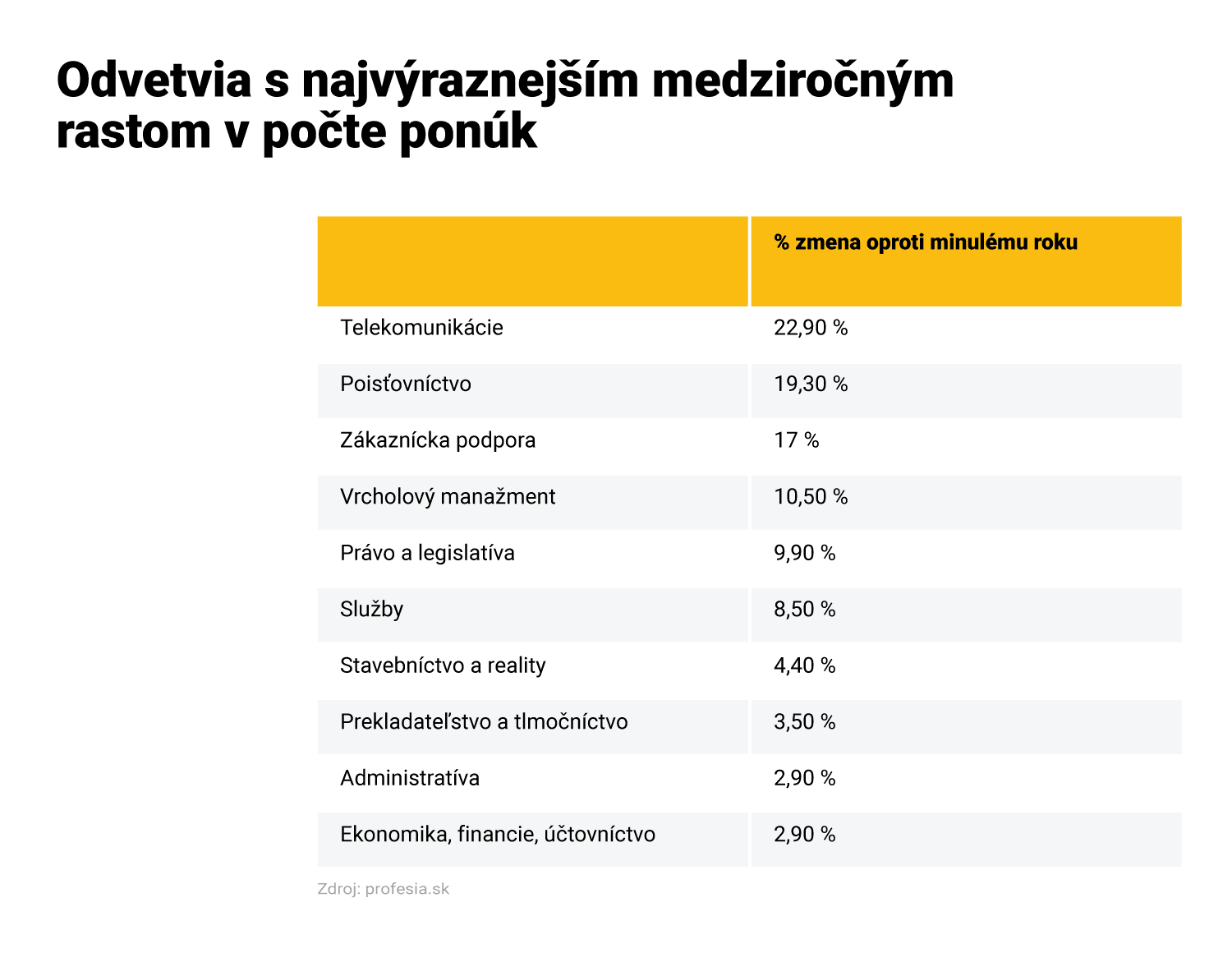 O viac ako desatinu rástol tiež počet ponúk v zákazníckej podpore a vrcholovom manažmente.