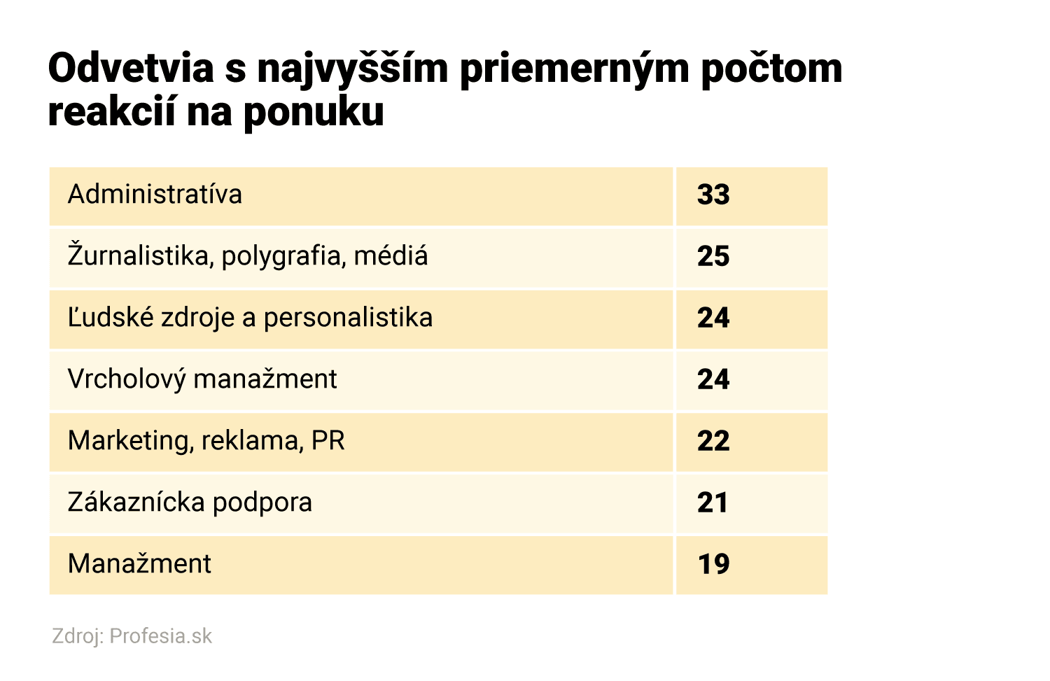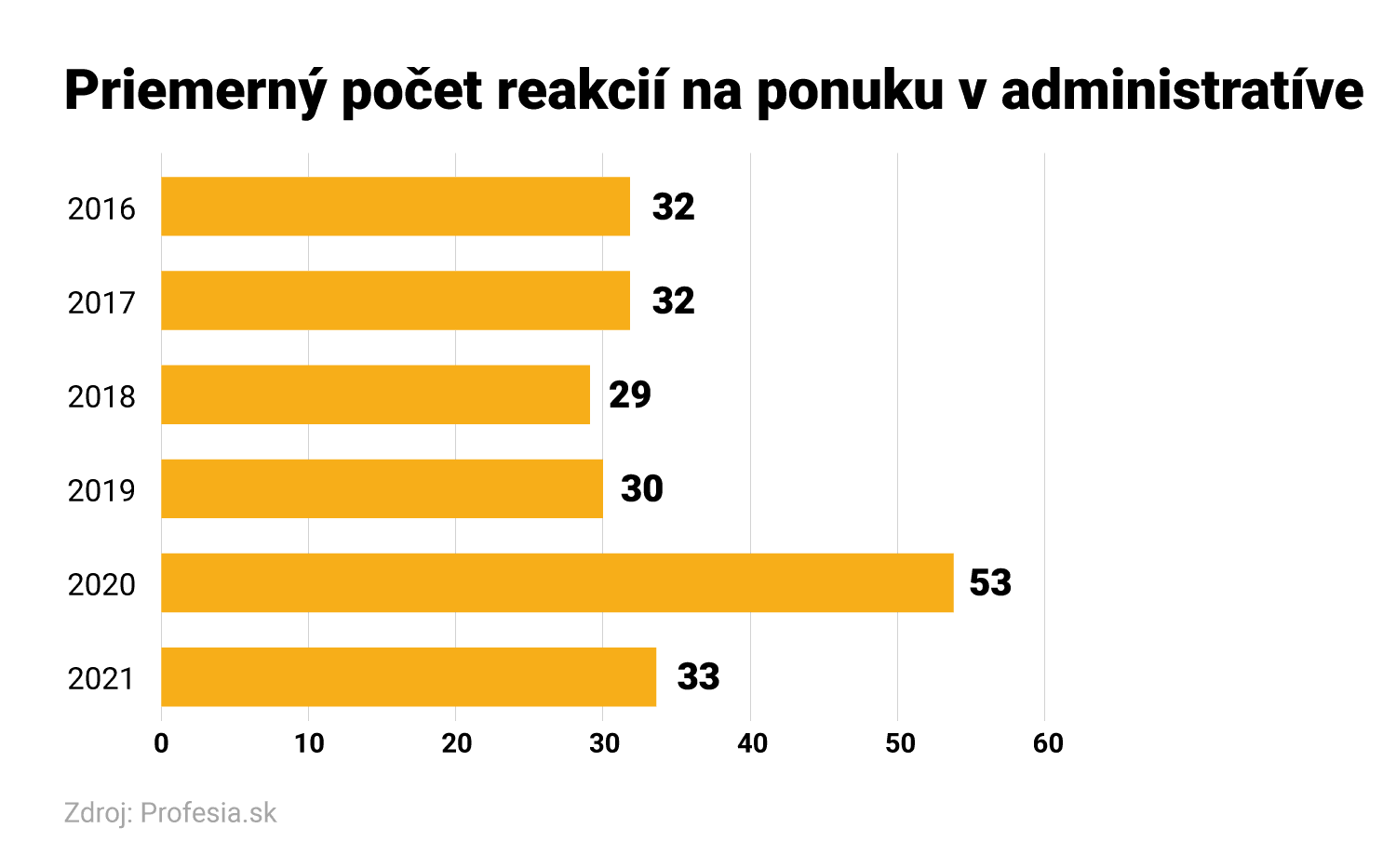 Spomedzi jednotlivých pracovných oblastí u uchádzačov na Slovensku jednoznačne vyhráva administratíva. Spomedzi 29-tisíc ponúk z tohto odvetvia zareagovalo v roku 2021 na každú v priemere 33 ľudí.