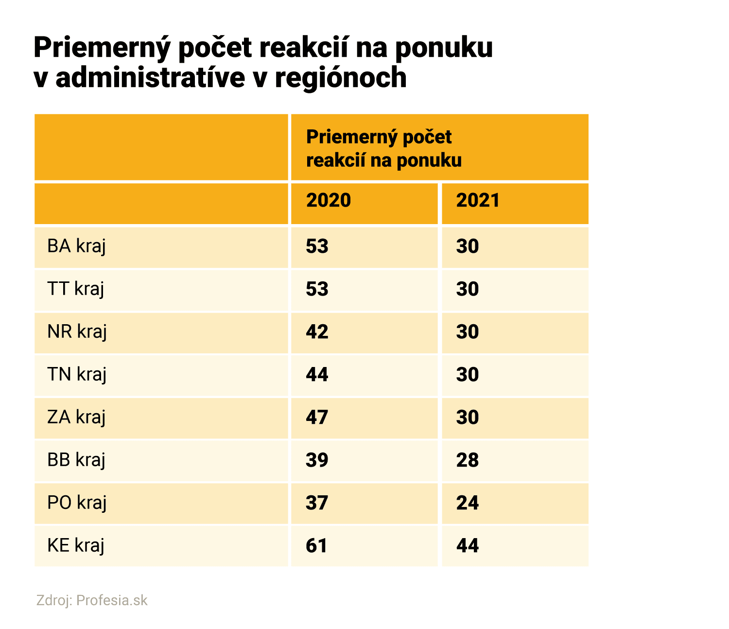 Spomedzi jednotlivých regiónov vidíme najväčší priemerný počet uchádzačov na administratívnu ponuku v Košickom kraji. Keď v roku 2020 pridala firma inzerát na administratívnu pozíciu v košickom regióne, dostala v priemere až 61 životopisov. Dnes je situácia z pohľadu ľudí lepšia. Na ponuku práce zareaguje v priemere 44 kandidátov.