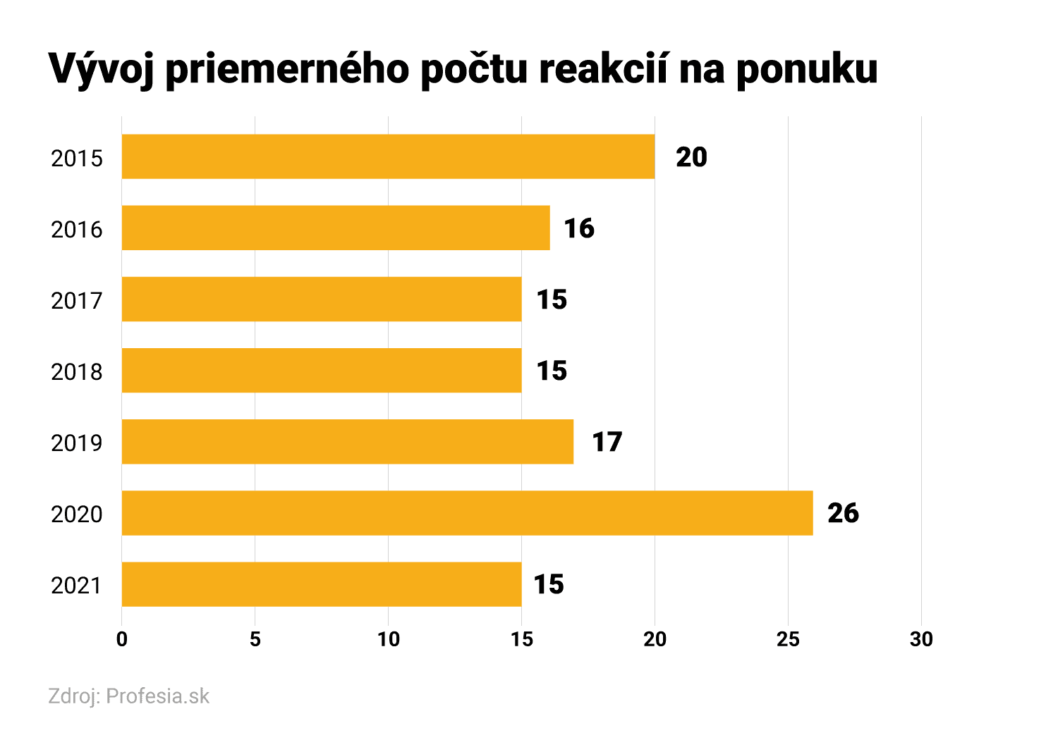 Nedávno ukončený rok 2021 priniesol nižšiu konkurenciu medzi uchádzačmi. Na jednu ponuku zareagovalo v priemere 15 ľudí. V roku 2020 to bolo až 26 kandidátov.