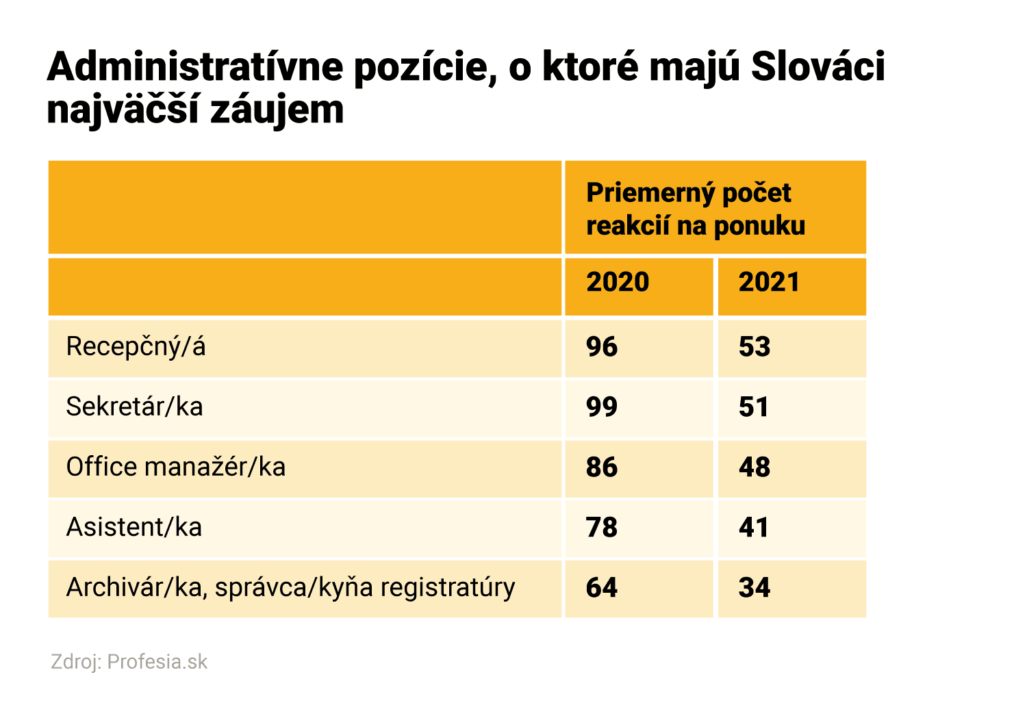 Keď uchádzač vidiel v roku 2020 na Profesii ponuku práce na recepčného/ú alebo sekretára/rku, mohol počítať s tým, že na ňu reagovalo v priemere takmer 100 uchádzačov. Tieto dve ponuky sú dlhodobo najobľúbenejšie. V roku 2021 sa priemerný počet reagujúcich ľudí znížil takmer o polovicu.