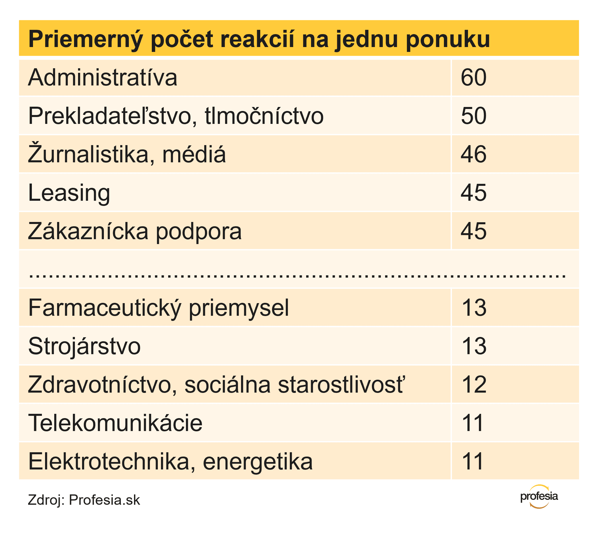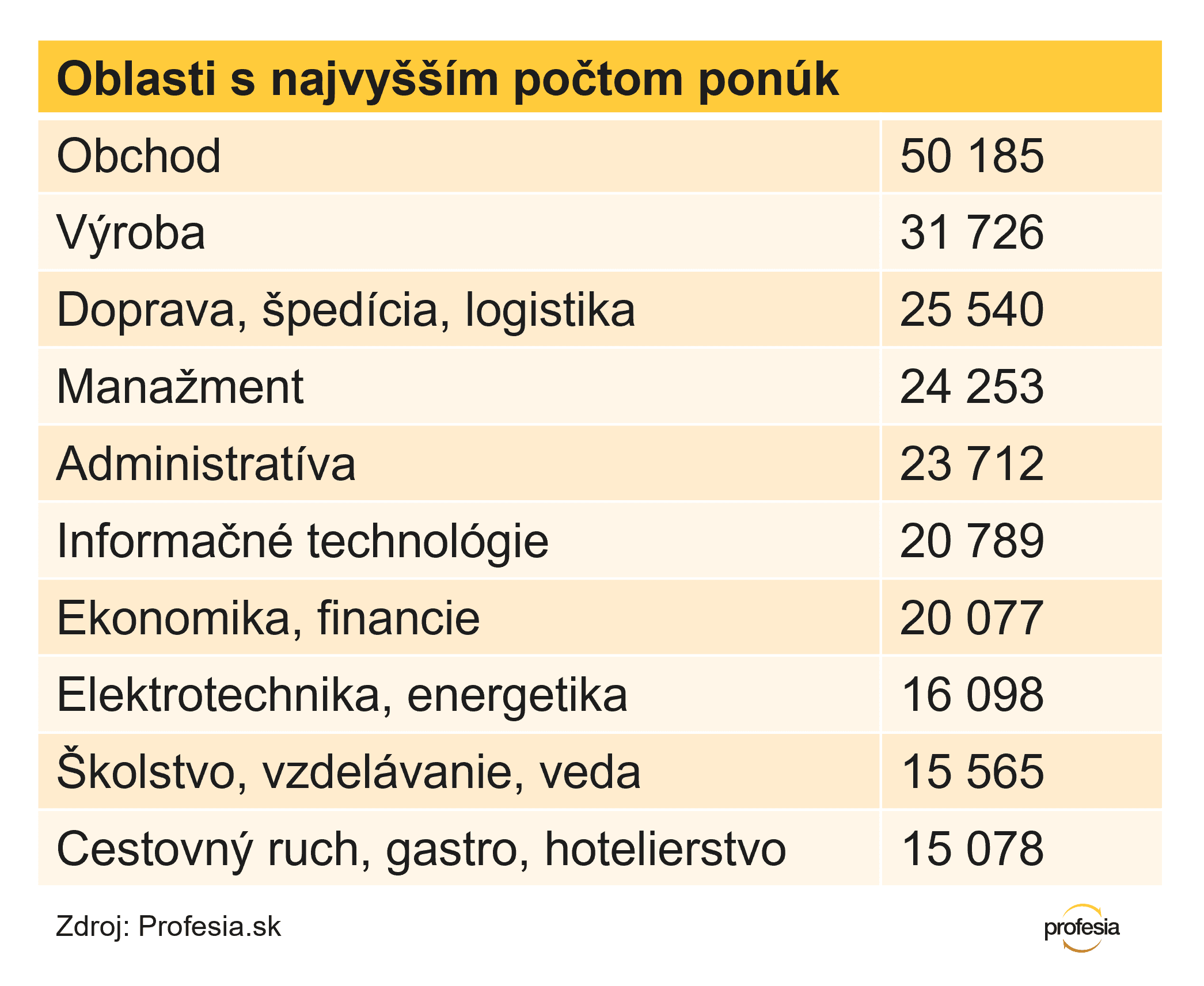Rovnako ako v roku 2024 aj vlani bolo na portáli Profesia najviac pracovných ponúk z oblasti obchodu, zamestnávatelia uverejnili vyše 50-tisíc inzerátov. Nasleduje výroba s takmer 32-tisíc ponukami a doprava, ktorá ponúkla prácu 25 500-krát.