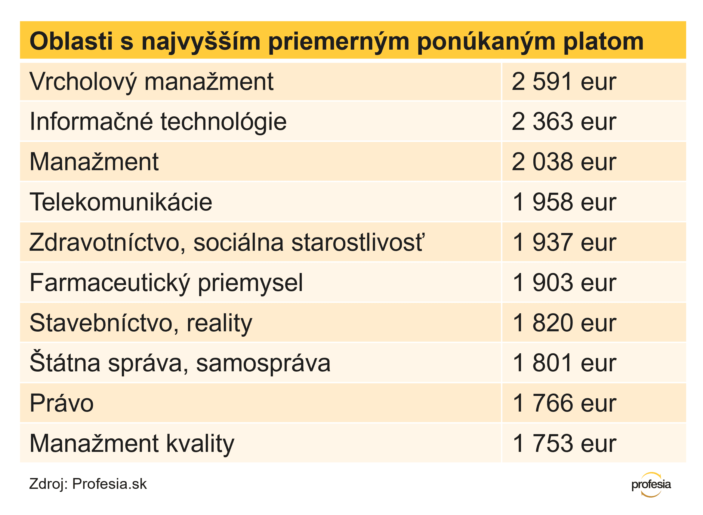 Priemerný ponúkaný plat bol v roku 2025 v inzerátoch na Profesii 1 594 eur, čo je oproti predchádzajúcemu roku nárast o 104 eurá. Uvádzané mzdy počas roka stúpali, vo štvrtom štvrťroku núkali firmy v priemere 1 659 eur. Najlepšie mohli zarobiť uchádzači, ktorí reagovali na ponuky práce vo vrcholovom manažmente, priemerný ponúkaný plat bol necelých 2 600 eur, o 200 eur menej uvádzali v priemere firmy v ponukách na IT pozície a okolo 2 000 eur v priemere ponúkali v inzerátoch z manažmentu aj telekomunikácií. Najnižšie finančné ohodnotenie bolo v textilnom priemysle, v priemere len čosi vyše 1 000 eur.