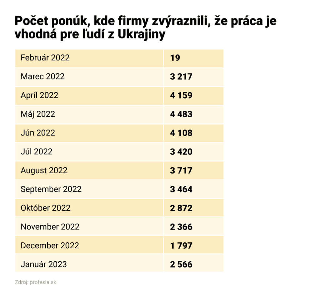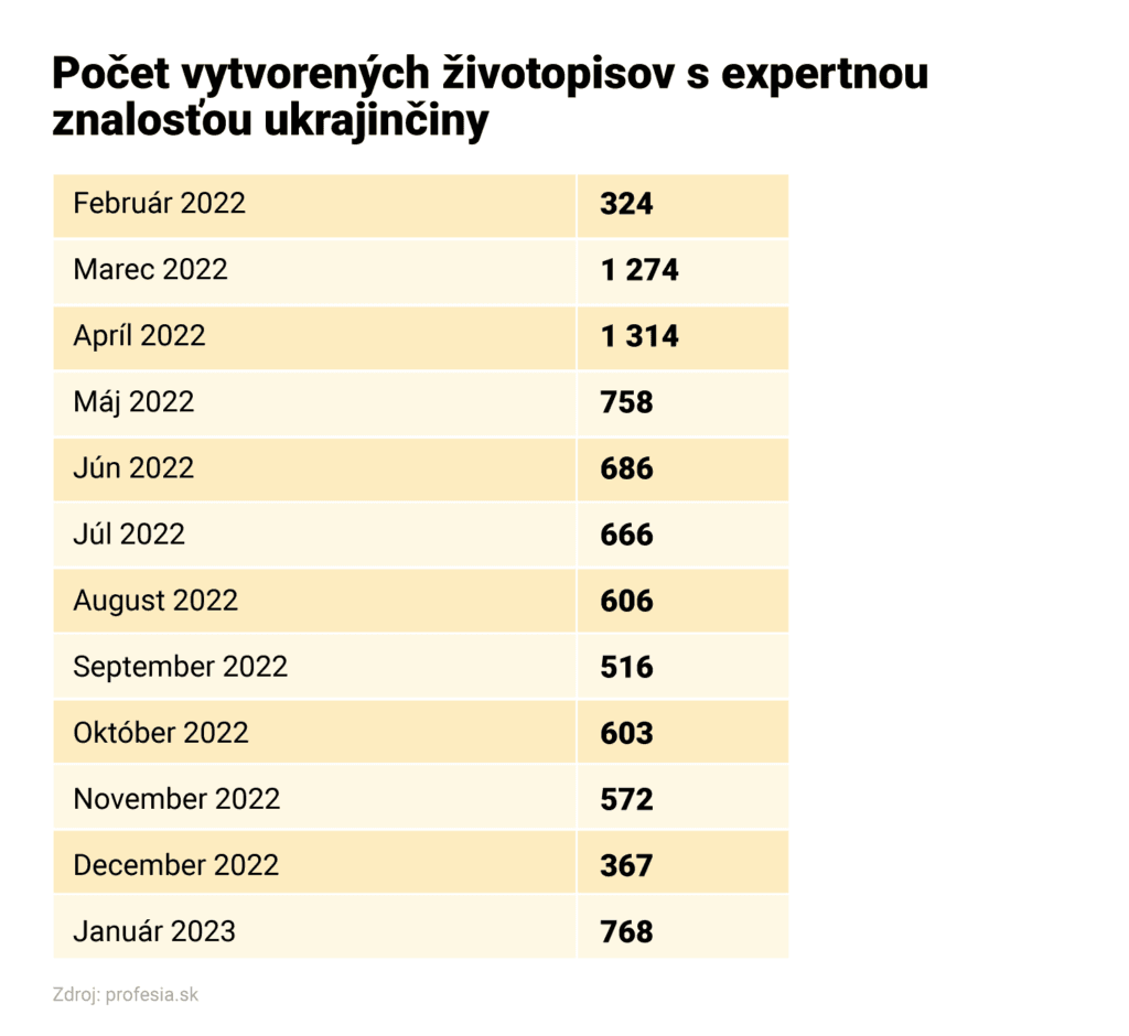 Od minulého februára až do konca januára 2023 si na Profesia.sk vytvorilo životopis takmer 8 500 Ukrajincov a Ukrajiniek. Do tohto počtu boli započítané všetky CV, v ktorých uchádzači/ky uviedli expertnú znalosť ukrajinského jazyka. Ide o úroveň C1 či C2.