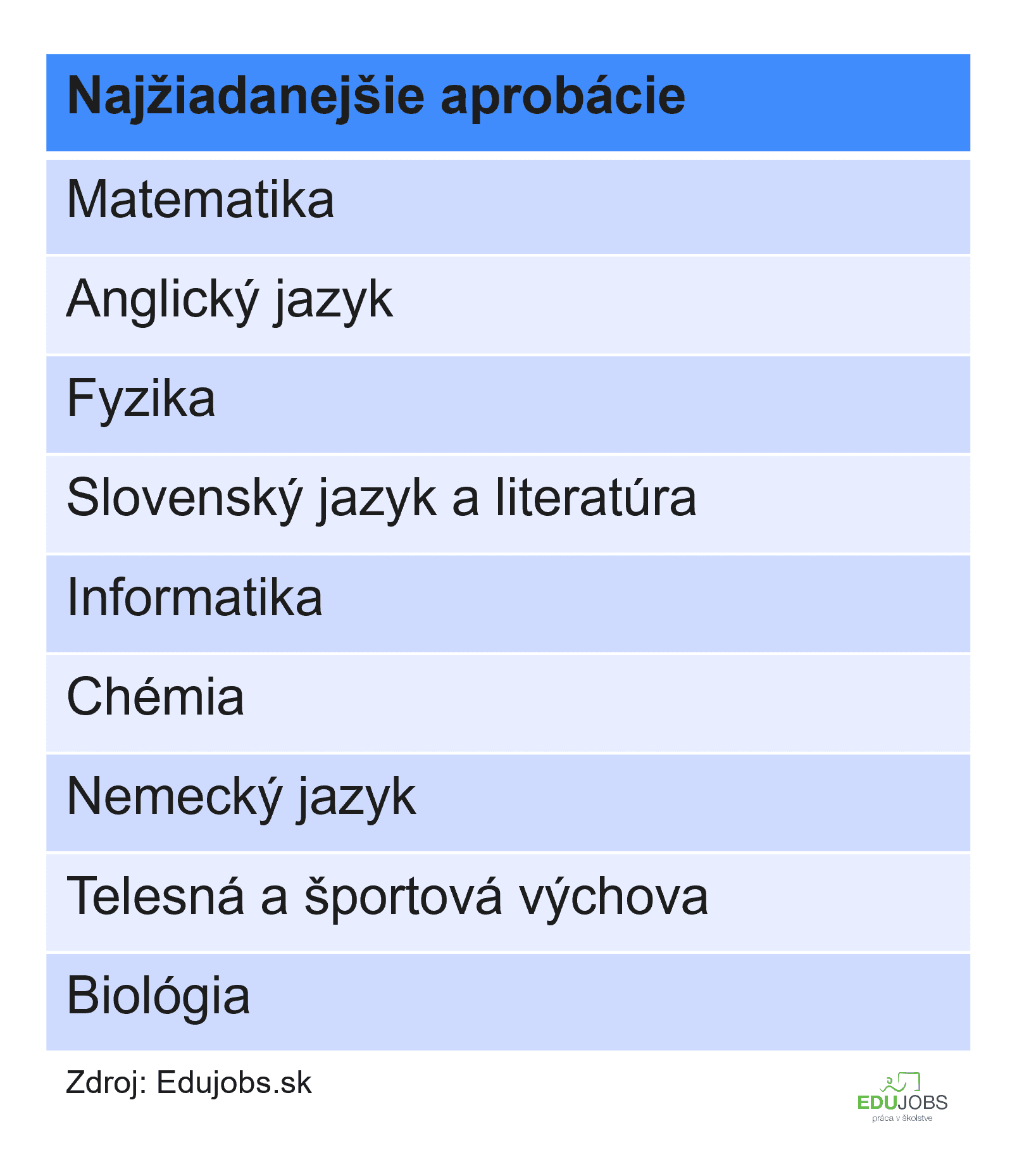 Necelý týždeň pred začiatkom nového školského roka chýba školám až 119 matematikárov alebo matematikárok, no na aktuálne zverejnené ponuky reagujú v priemere len dvaja ľudia. Angličtinári a angličtinárky sú druhí najžiadanejší, chýba ich 85, no v tomto prípade majú školy o čosi viac kandidátov a kandidátok, keďže na momentálne aktívne ponuky reaguje v priemere 7 ľudí. Školám chýba aj viac ako 50 učiteľov a učiteliek fyziky a slovenského jazyka a literatúry.