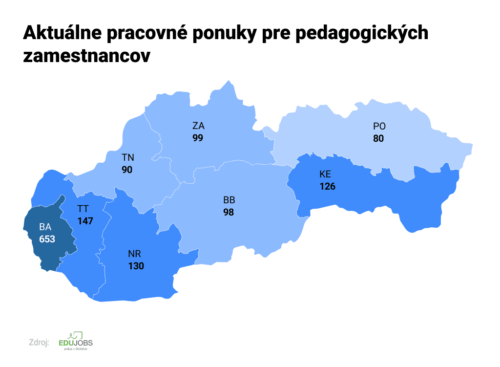 Takmer polovica z aktuálne zverejnených ponúk na pedagogické pozície je z Bratislavského kraja - momentálne je aktívnych 653 inzerátov. Desatina je z Trnavského kraja, o pár ponúk menej zverejnili školy z Nitrianskeho a Košického kraja.