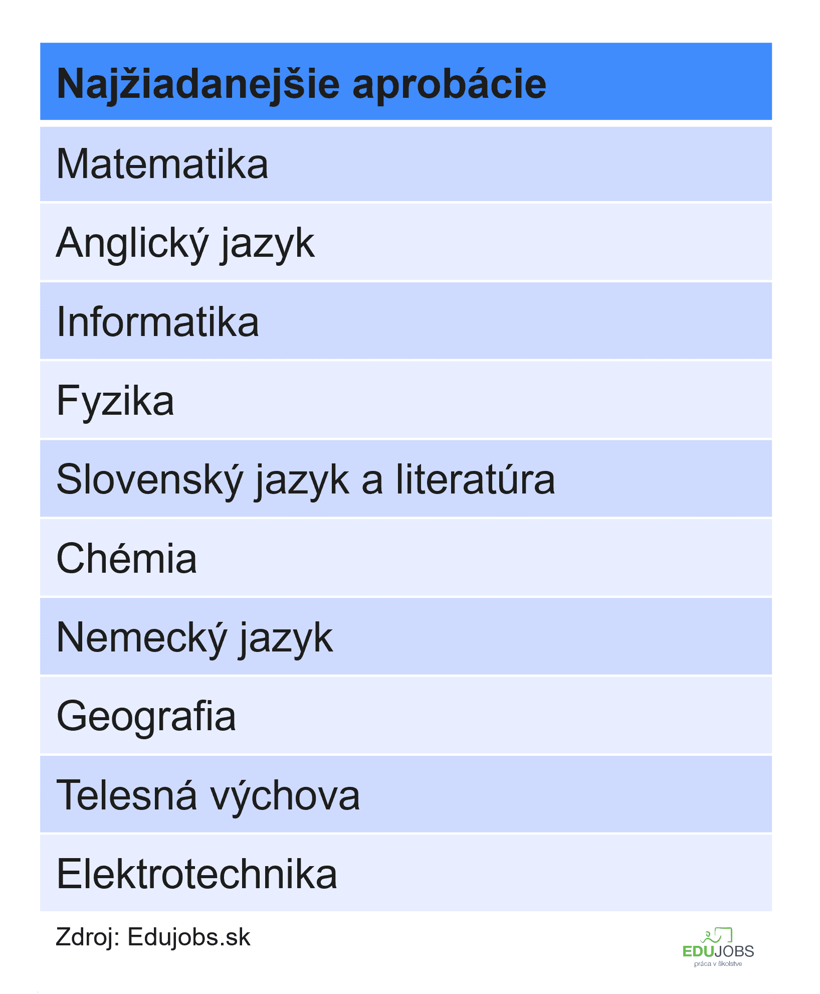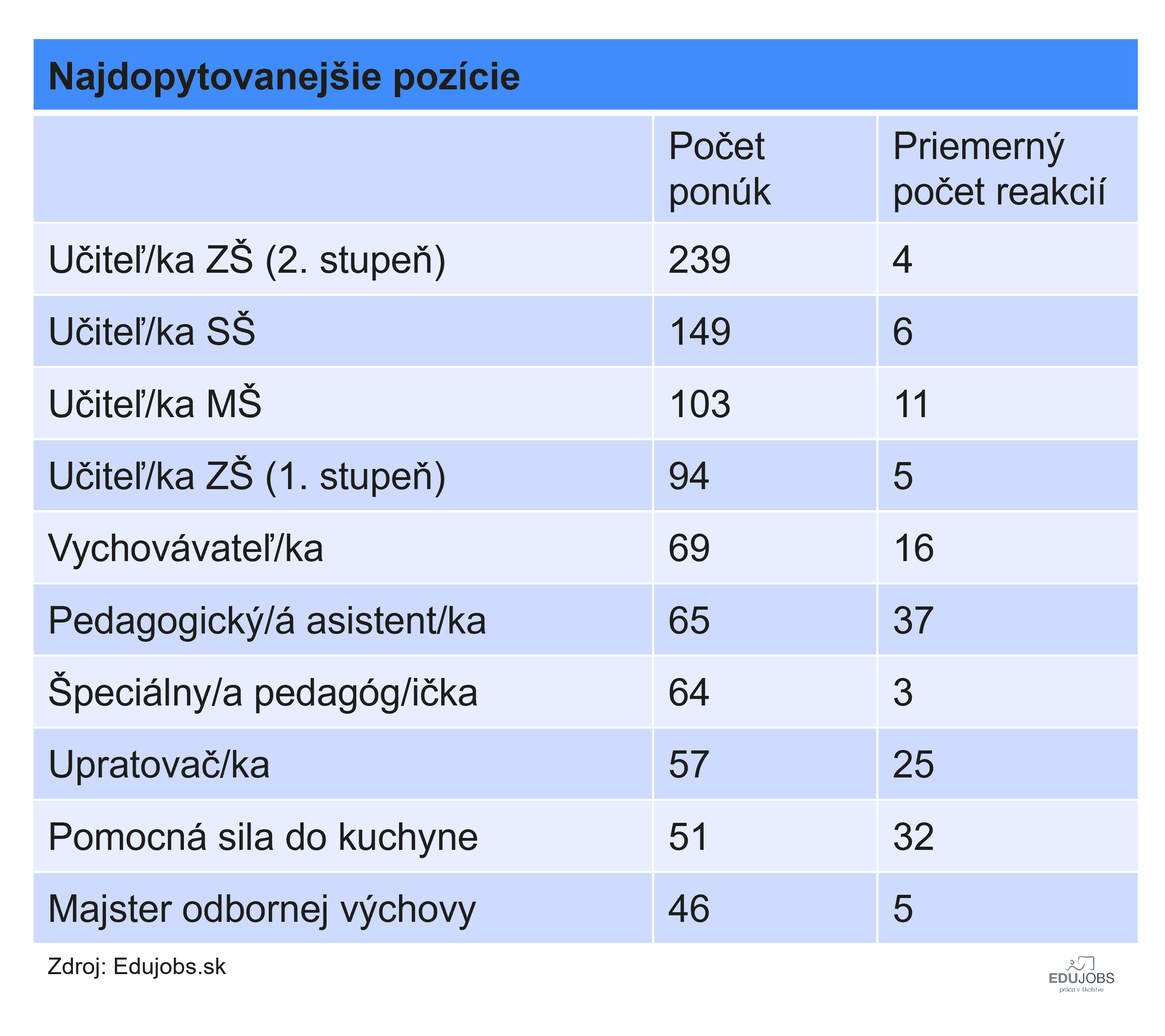 Najväčší dopyt je po učiteľoch a učiteľkách na 2. stupeň základných škôl, aktívnych je 239 ponúk, 149 inzerátov je na učiteľov na stredné školy a treťou najdopytovanejšou pozíciou je učiteľ v materskej škole so 103 ponukami, necelých 100 inzerátov je na pedagógov na 1. stupeň základných škôl. Spolu tak aktuálne hľadajú základné a stredné školy 482 učiteľov a učiteliek.