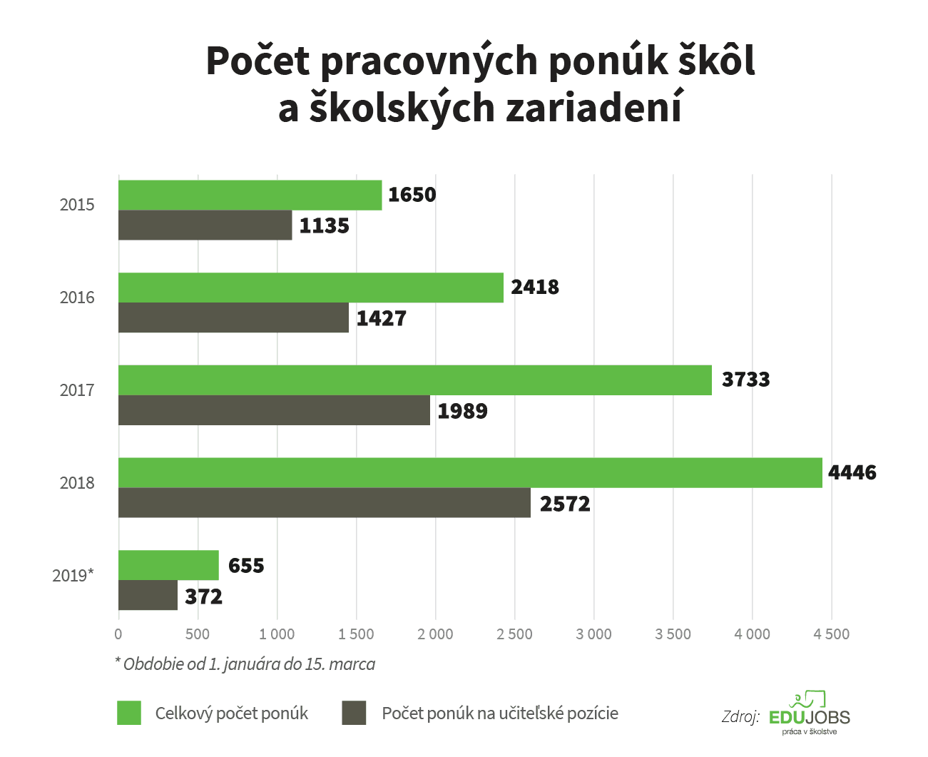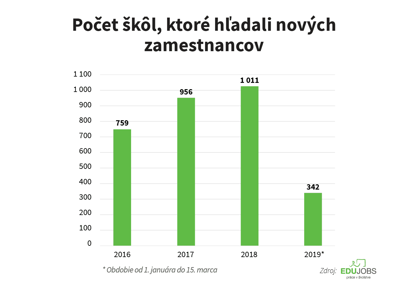 Čísla z roku 2019 pritom nasvedčujú, že dopyt po nových ľuďoch v súčasnosti zďaleka neutícha. V období od 1. januára do 15. marca 2019 bolo uverejnených 655 pracovných ponúk, pričom v prípade 372 z nich išlo o učiteľské pozície.